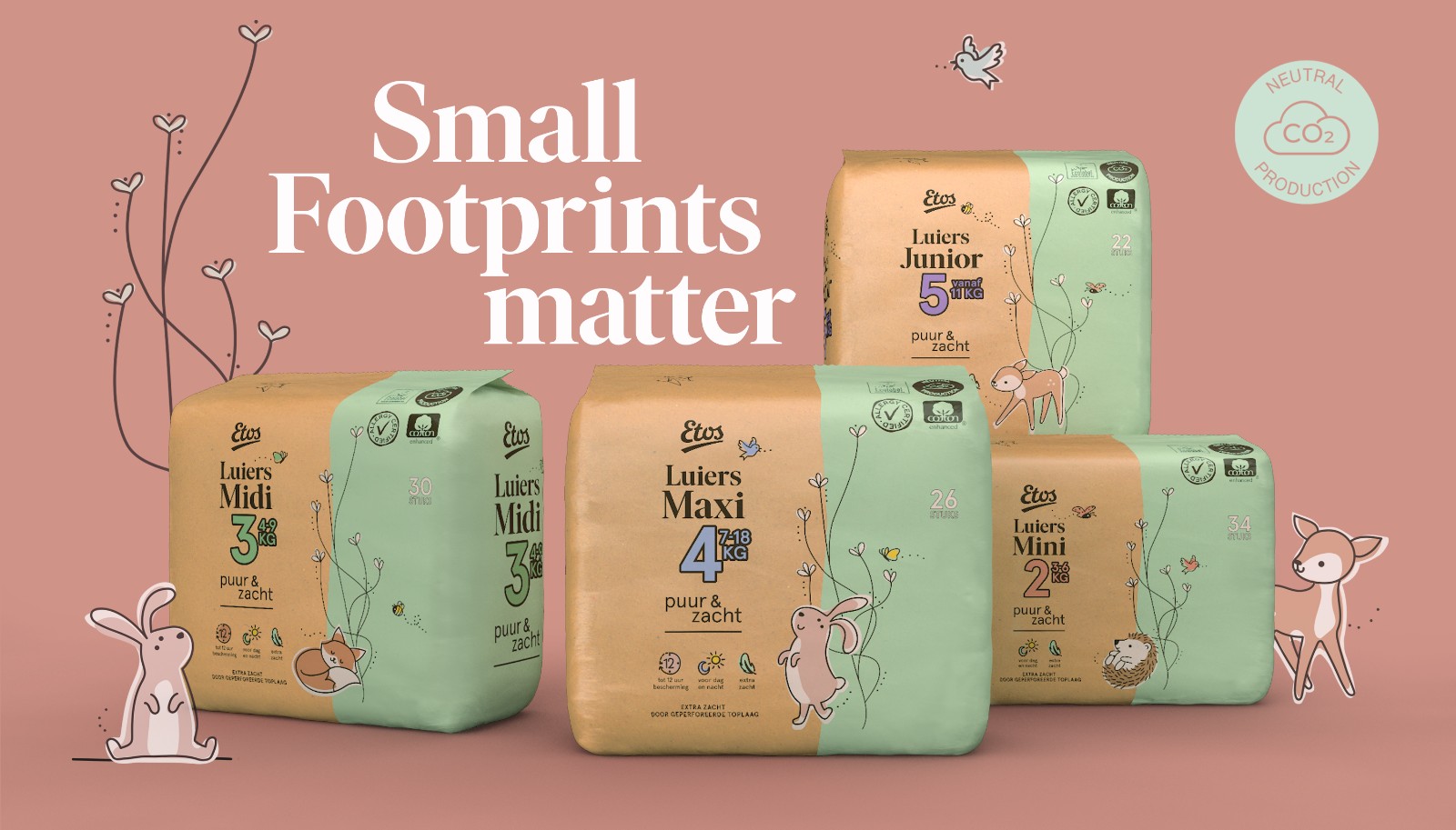 一次性尿布是臭名昭著的污染者。因此,當(dāng)領(lǐng)先的荷蘭連鎖藥店 Etos 推出新一代環(huán)保尿布時(shí),其潛在影響(聯(lián)合國可持續(xù)發(fā)展目標(biāo) 12)是巨大的。他們要求我們設(shè)計(jì)出完全可持續(xù)的包裝,以吸引他們所針對(duì)的社會(huì)和環(huán)境進(jìn)步的父母。