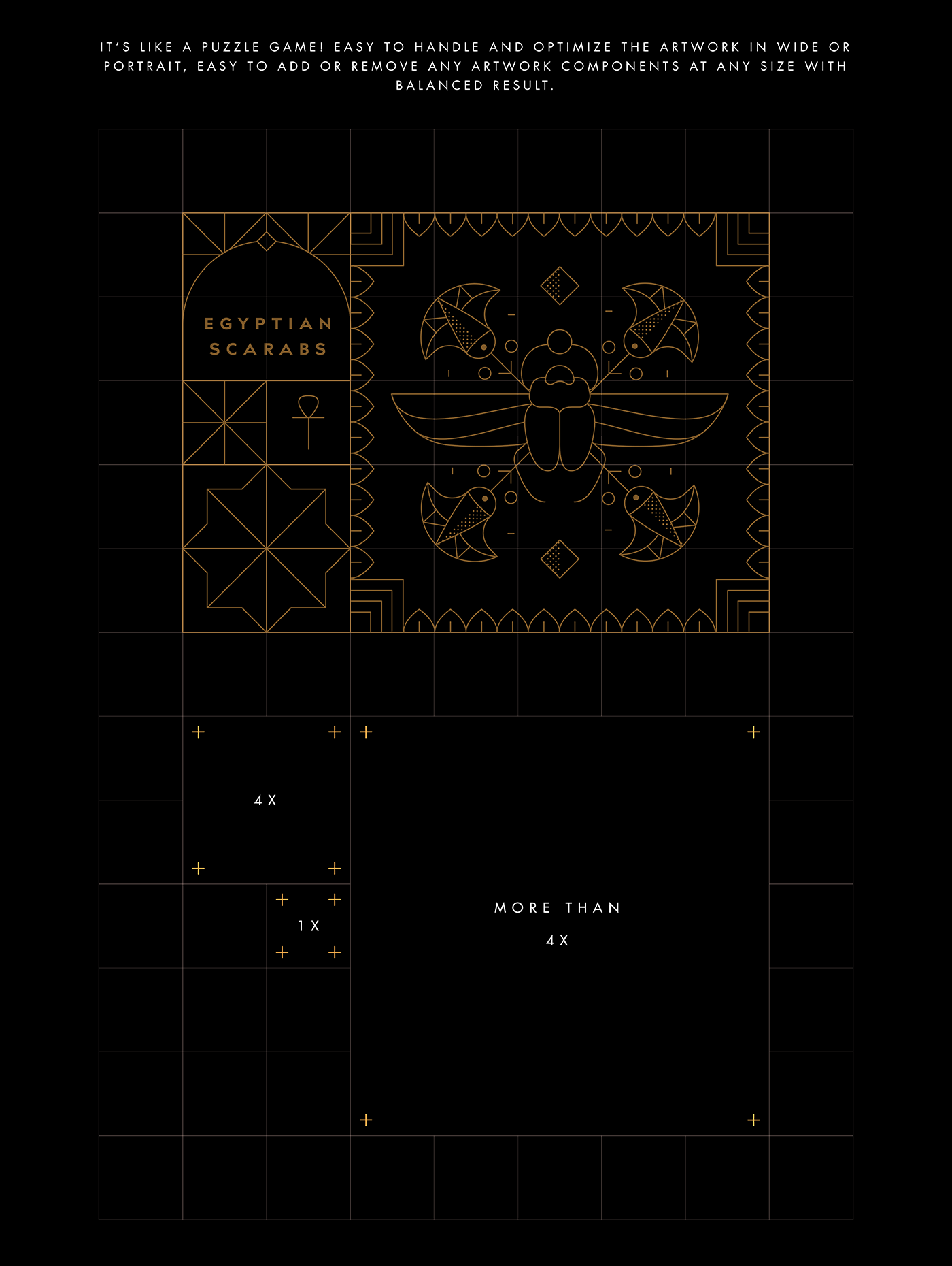 It's like a puzzle game! easy to handle and optimize the atework in wide or portrait,easy to add or remove any artwork components at any size with balanced result