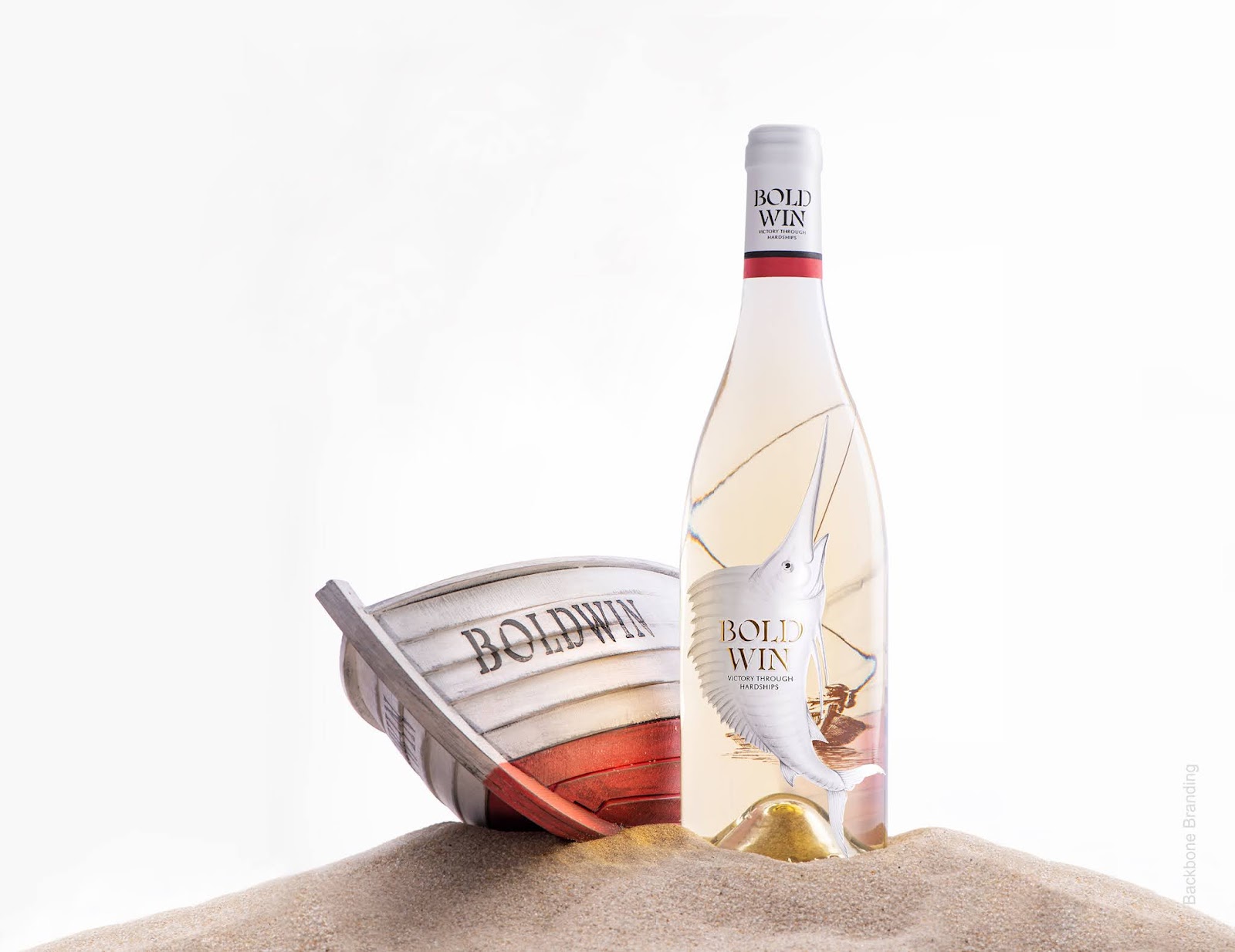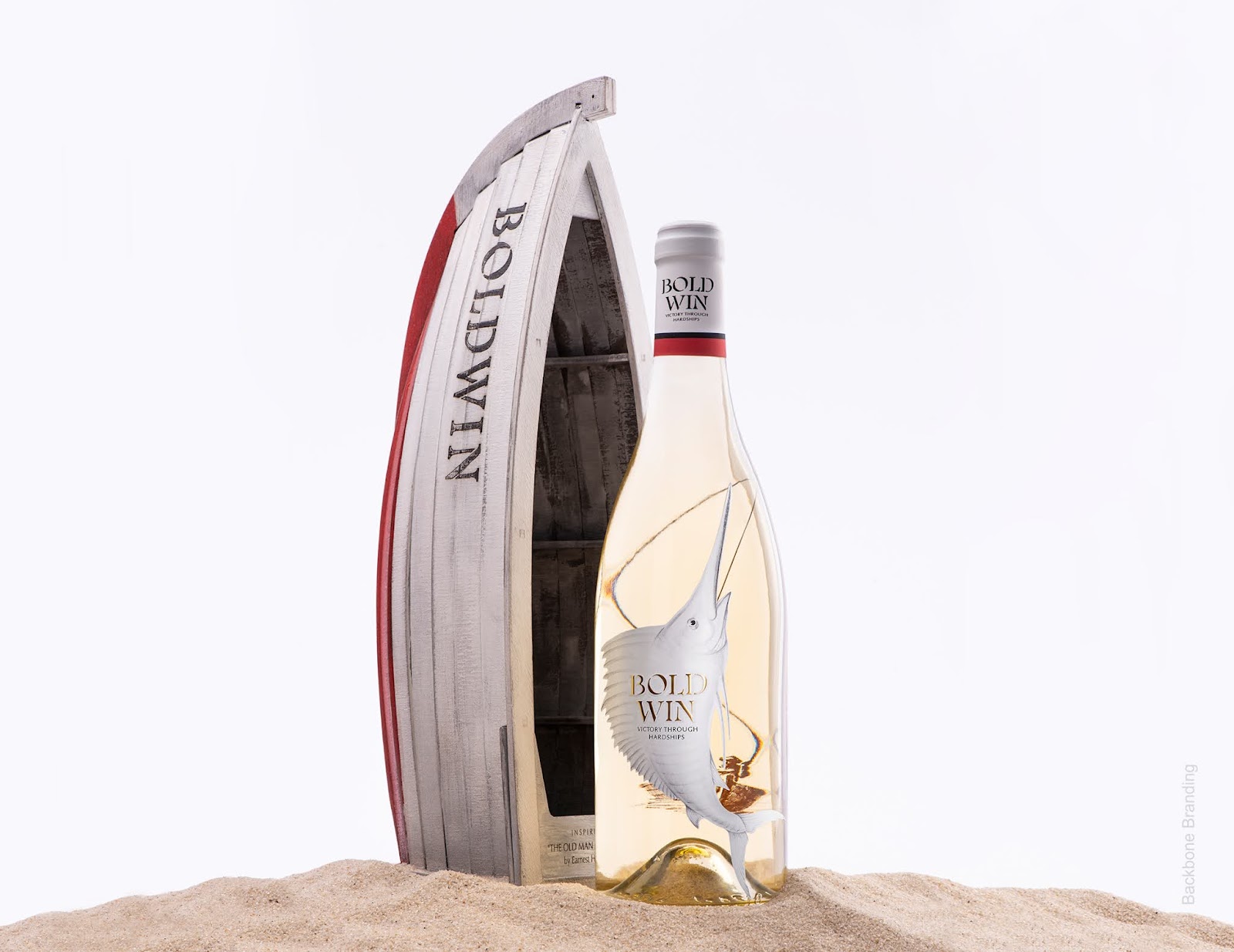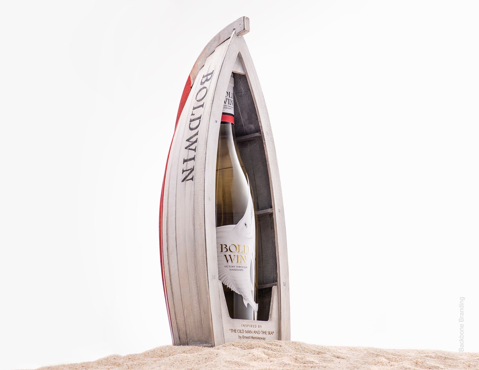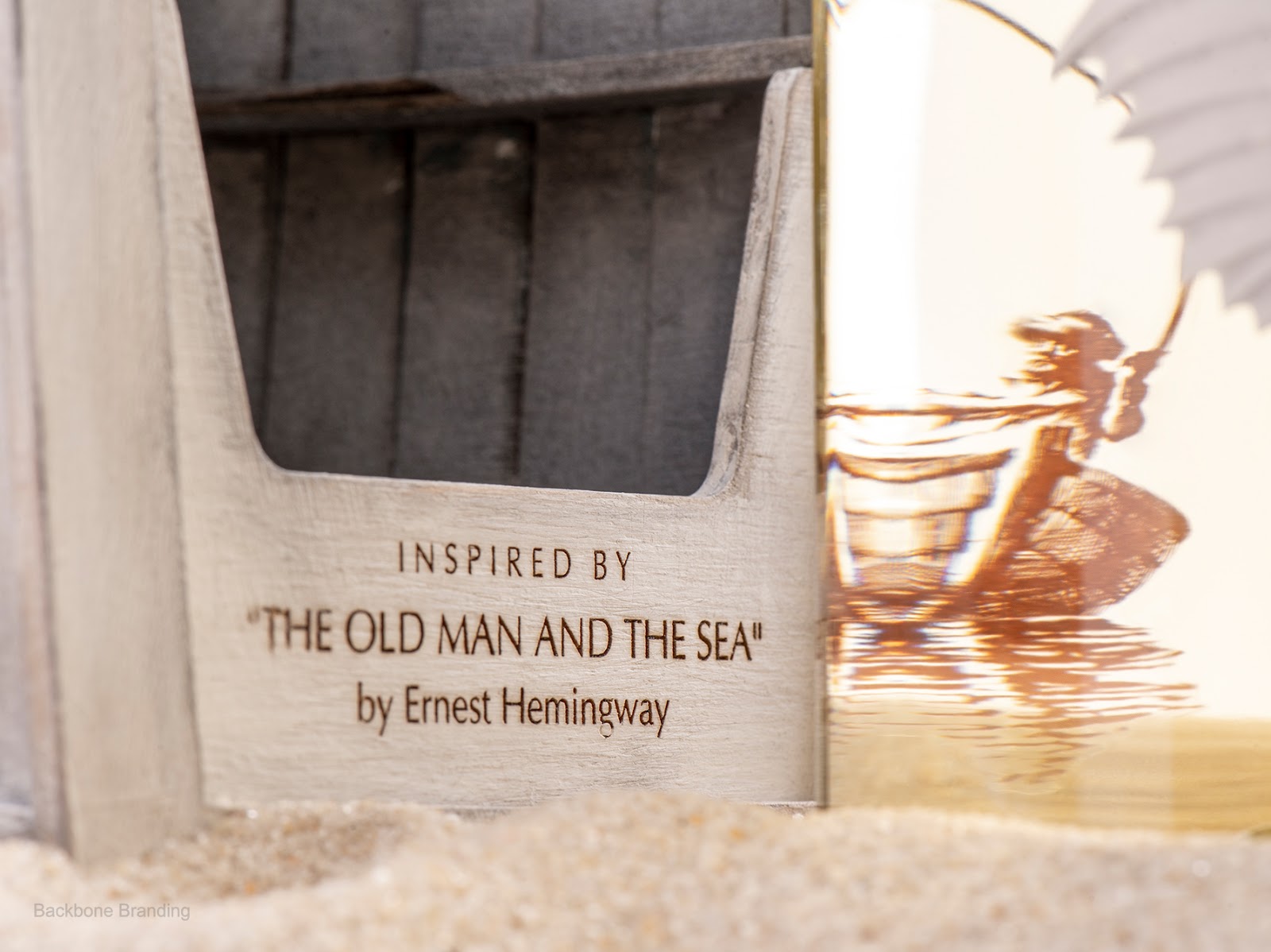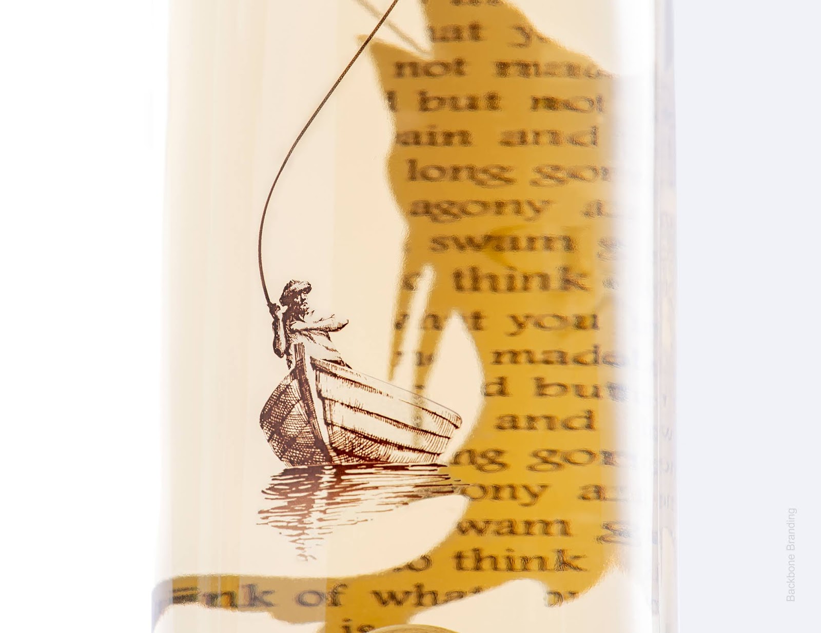 瓶子的包裝是船本身,它象征著我們每天選擇離開公海,為值得為之奮斗的東西而奮斗。如果你從老人和他的船的側(cè)面看瓶子,你會(huì)看到馬林魚標(biāo)簽背面引用了海明威的故事。這些文本象征著克服每一個(gè)挑戰(zhàn)和困難的過程:故事造就了我們。