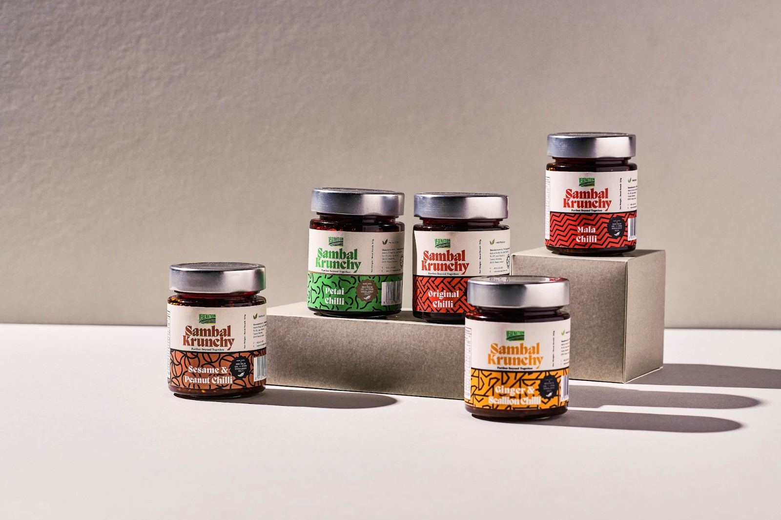 PILGRIMS BRAND STUDIO 負責為 Vegenation 設計品牌標識和藝術指導。Vegenation 是一家馬來西亞有機素食公司,致力于為世界帶來美味健康的素食產品。受馬來西亞傳統(tǒng)蠟染圖案的啟發(fā),包裝設計師對其進行了現(xiàn)代化和最小化,并將其轉化為大膽的圖案,以反映每種口味的味道和質地. 鮮艷的顏色背景是根據蔬菜產品的顏色挑選的,它們充滿活力和色彩。我們基于這個想法為他們的第一個產品 Sambal Krunchy 創(chuàng)建了一系列包裝設計。