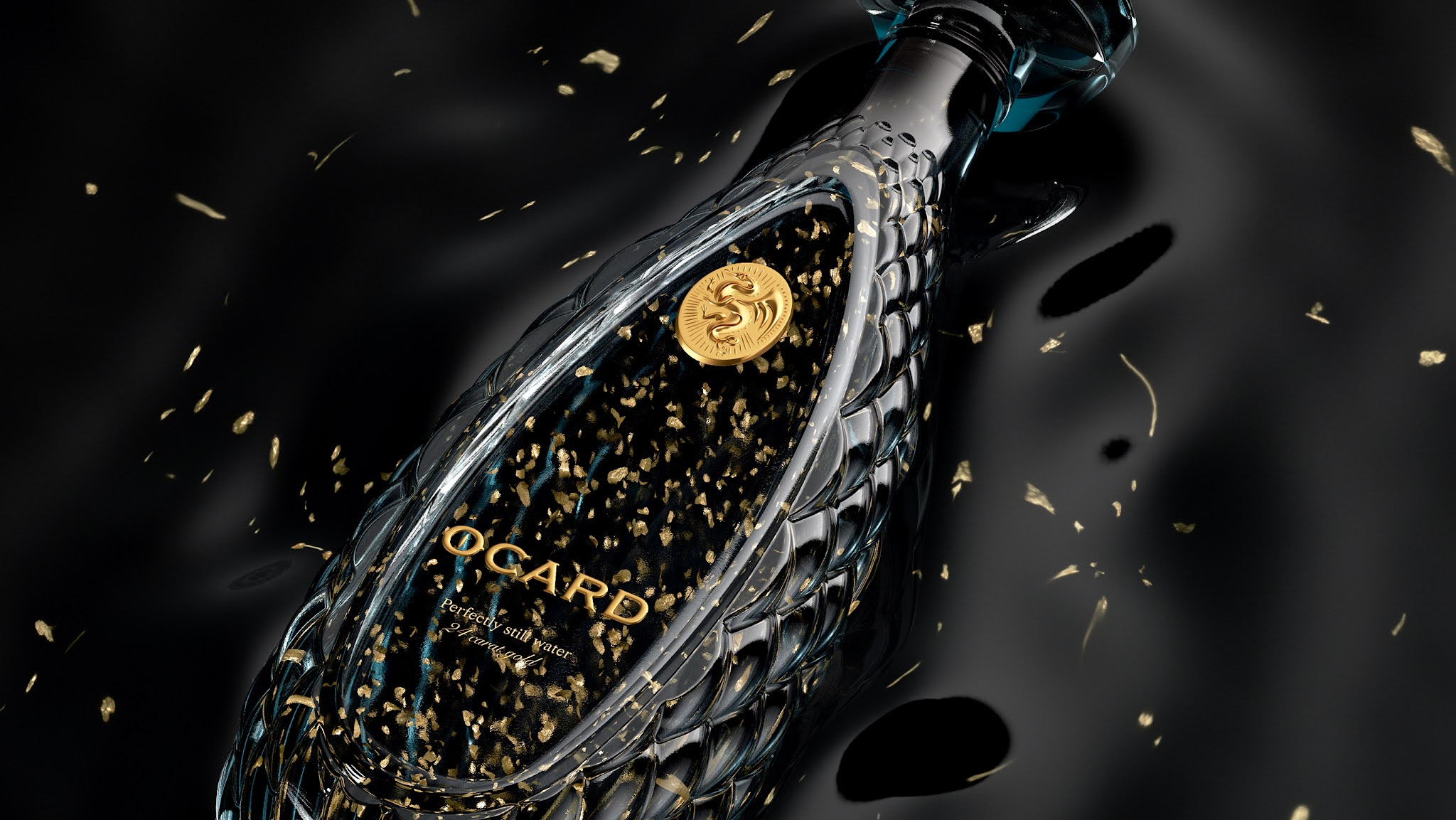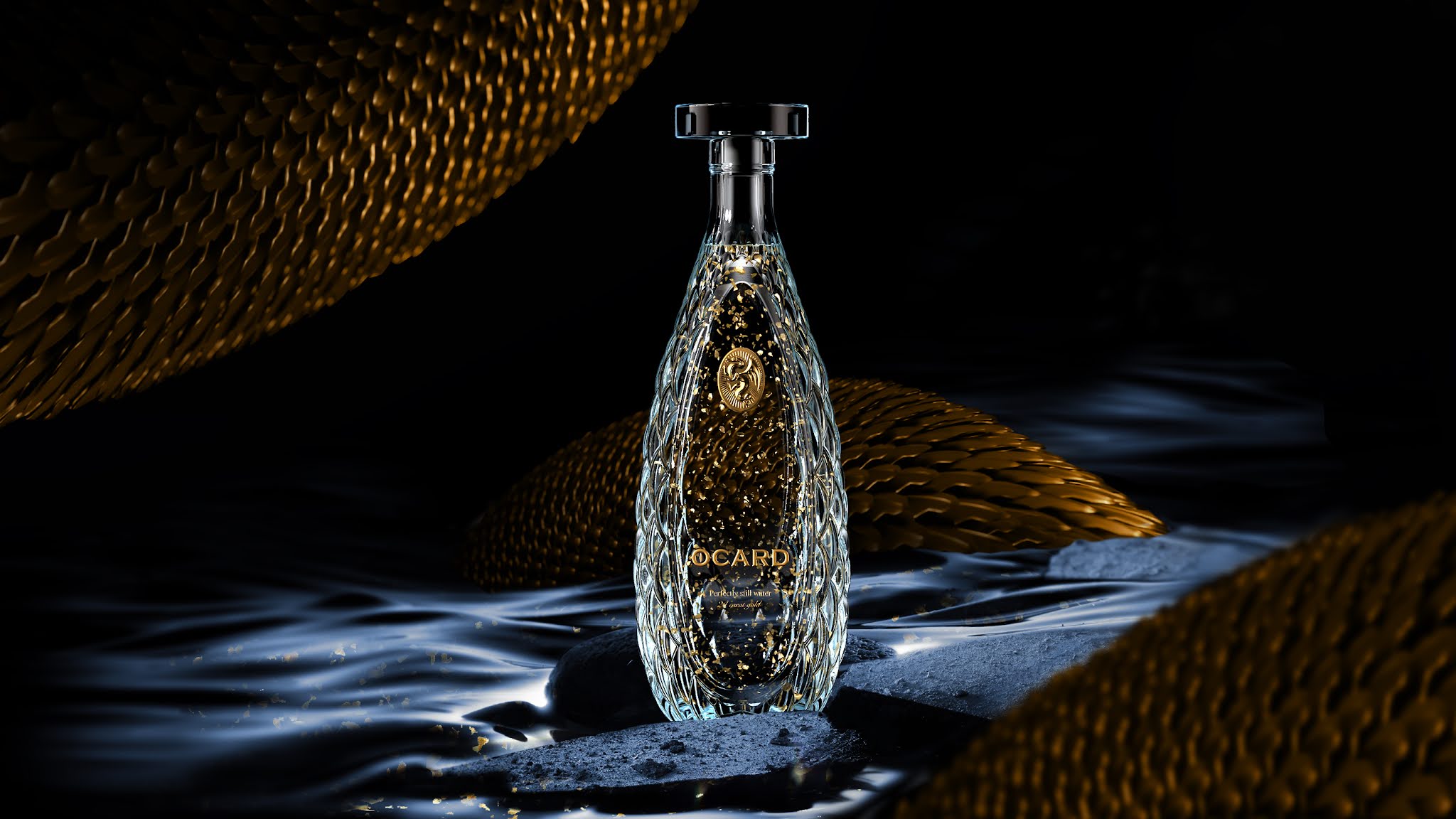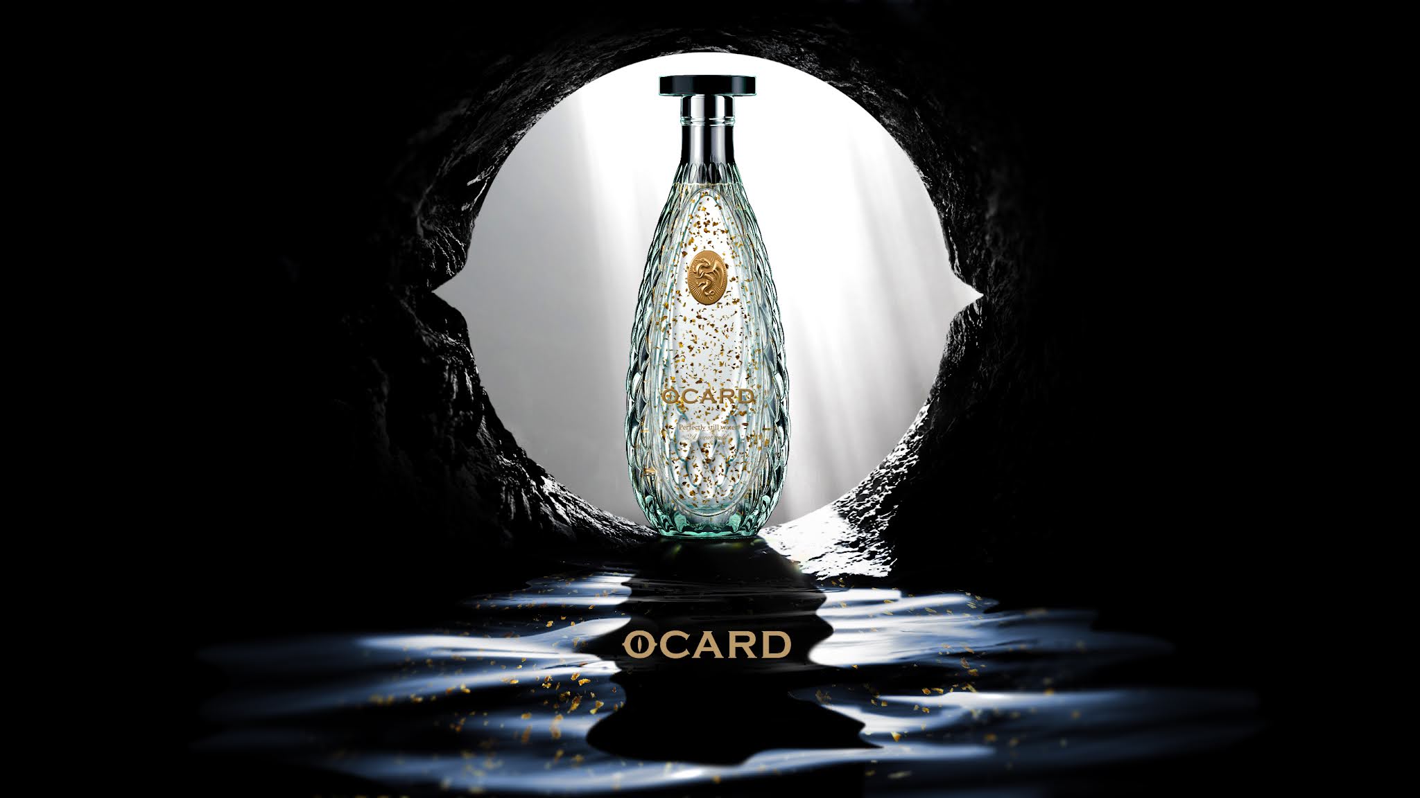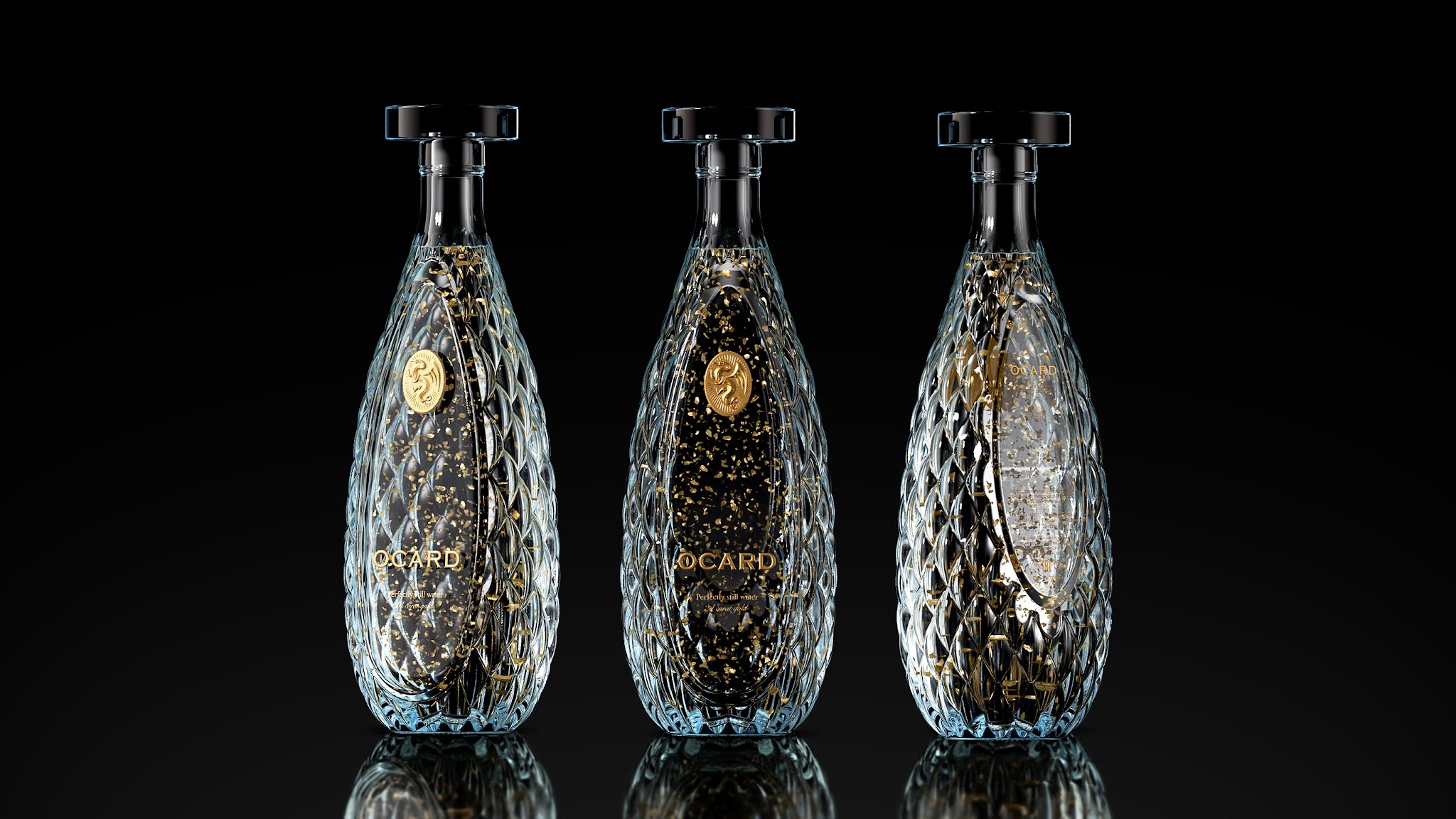 在烏茲別克斯坦有一個(gè)關(guān)于地下泉水由金龍守護(hù)的傳說。它的水里有金片,喝了它的人會(huì)獲得永恒的青春。我們將這一傳說視為黃金優(yōu)質(zhì)水的品牌故事。我們將品牌命名為Ocard,它是一種反向Draco。我們制作了一個(gè)獨(dú)特的玻璃瓶,上面覆蓋著“龍鱗”。上面幾乎什么也沒有:只有“o”字上有龍眼的標(biāo)志和有龍的獎(jiǎng)?wù)隆?/p>