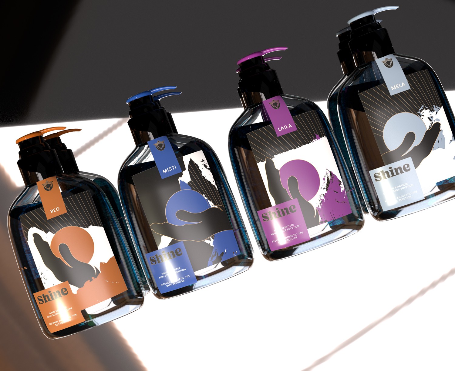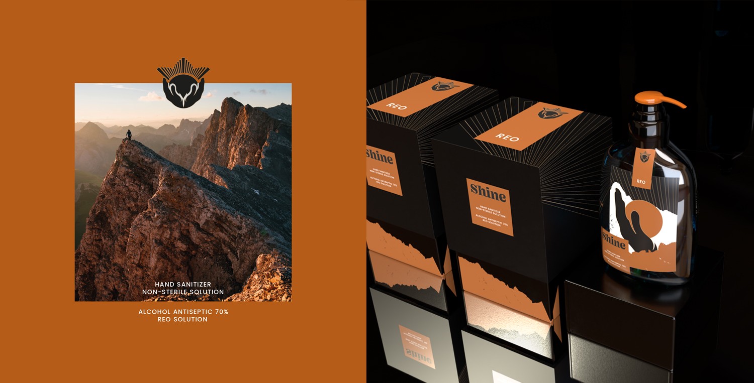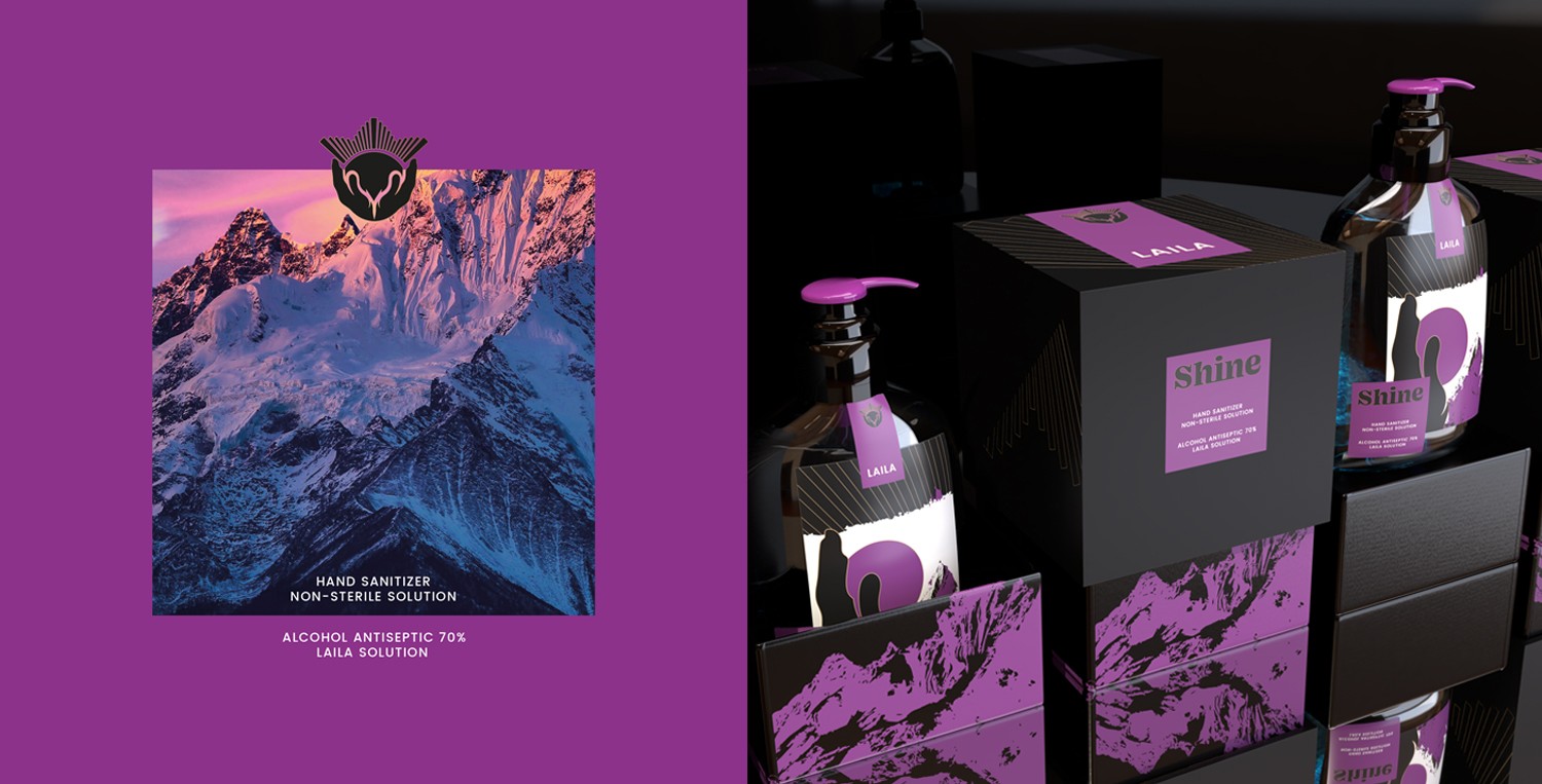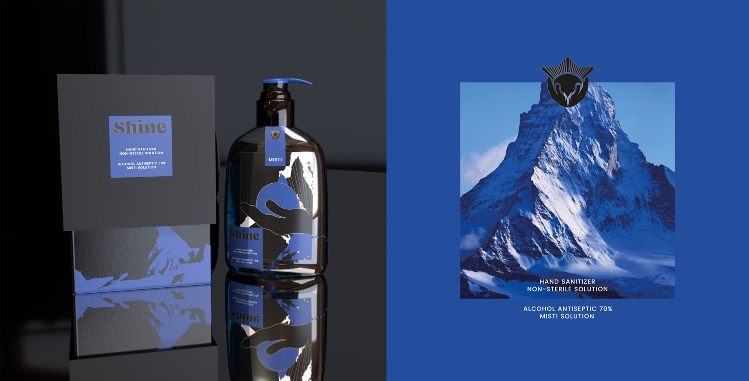 包裝背后的理念是傳達高品位的外觀和感覺,以幫助品牌在市場中閃耀。標(biāo)簽設(shè)計通過展示一只伸著太陽的手(比喻在手上使用消毒劑)與不同形狀的山脈以一種抽象的方式結(jié)合,圍繞忠誠、激情和移情的品牌核心價值體現(xiàn)了品牌信息。整個產(chǎn)品的色調(diào)選擇,以喚起不同季節(jié)的陽光照射在山上的氣氛。