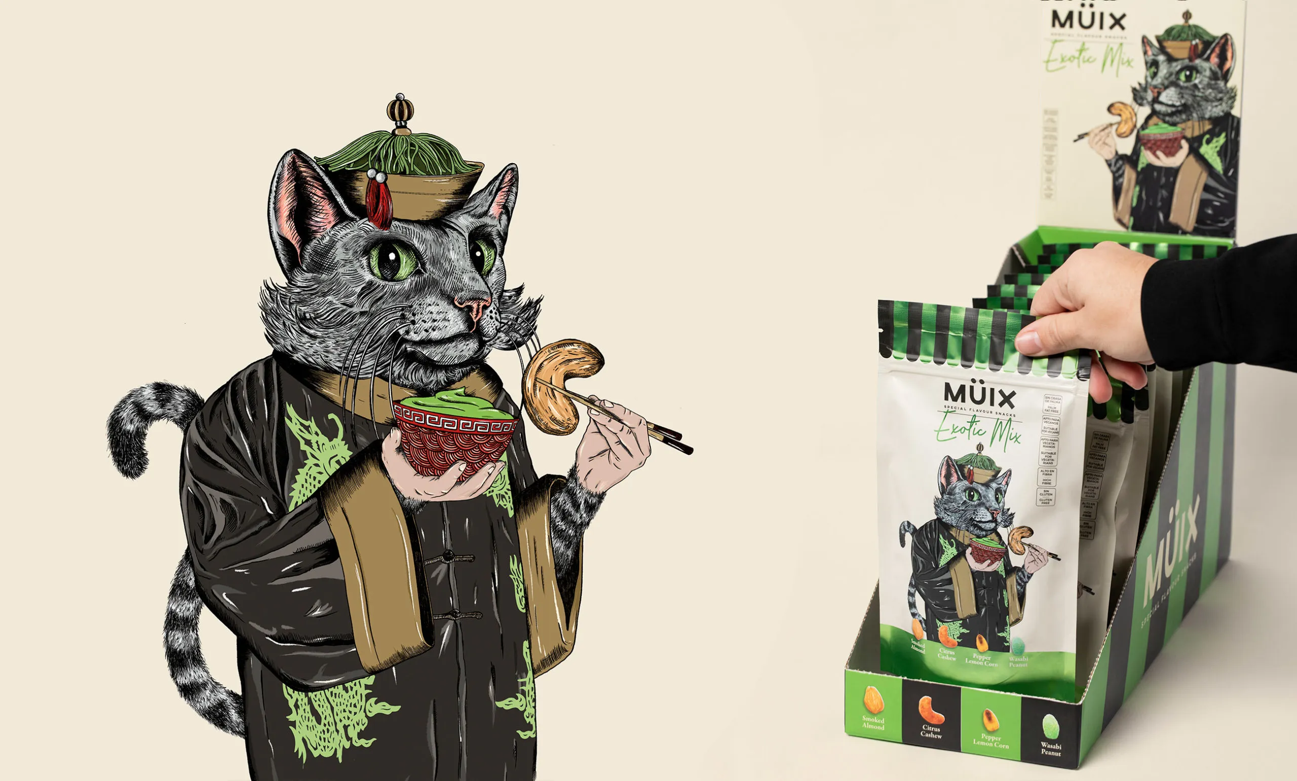 我們的包裝方案包括創(chuàng)建不同的插圖字符,以代表每種混合的特色風(fēng)味。農(nóng)民公雞為“鄉(xiāng)村混搭”,原汁原味的鄉(xiāng)村傳統(tǒng)風(fēng)味;“Yankee Mix”的棒球浣熊,美國風(fēng)味,混合了煙熏燒烤和辣椒的辛辣味道;童子軍熊的“Hunny Mix”,權(quán)力的特克斯墨西哥與甜蜜的蜂蜜,將帶我們回到童年;大師喚醒貓代表“異國情調(diào)的混合”,一次日本壽司酒吧之旅,混合了芥末、柑橘和胡椒;最后,這只獅子狗配上瑪麗·安托瓦內(nèi)特(Marie Antoinette)的“皇家混合口味”,這是一種甜而復(fù)雜的口味,將我們帶到法國競選運動的糖果店,散發(fā)著橘子、開心果和蜂蜜的芳香。