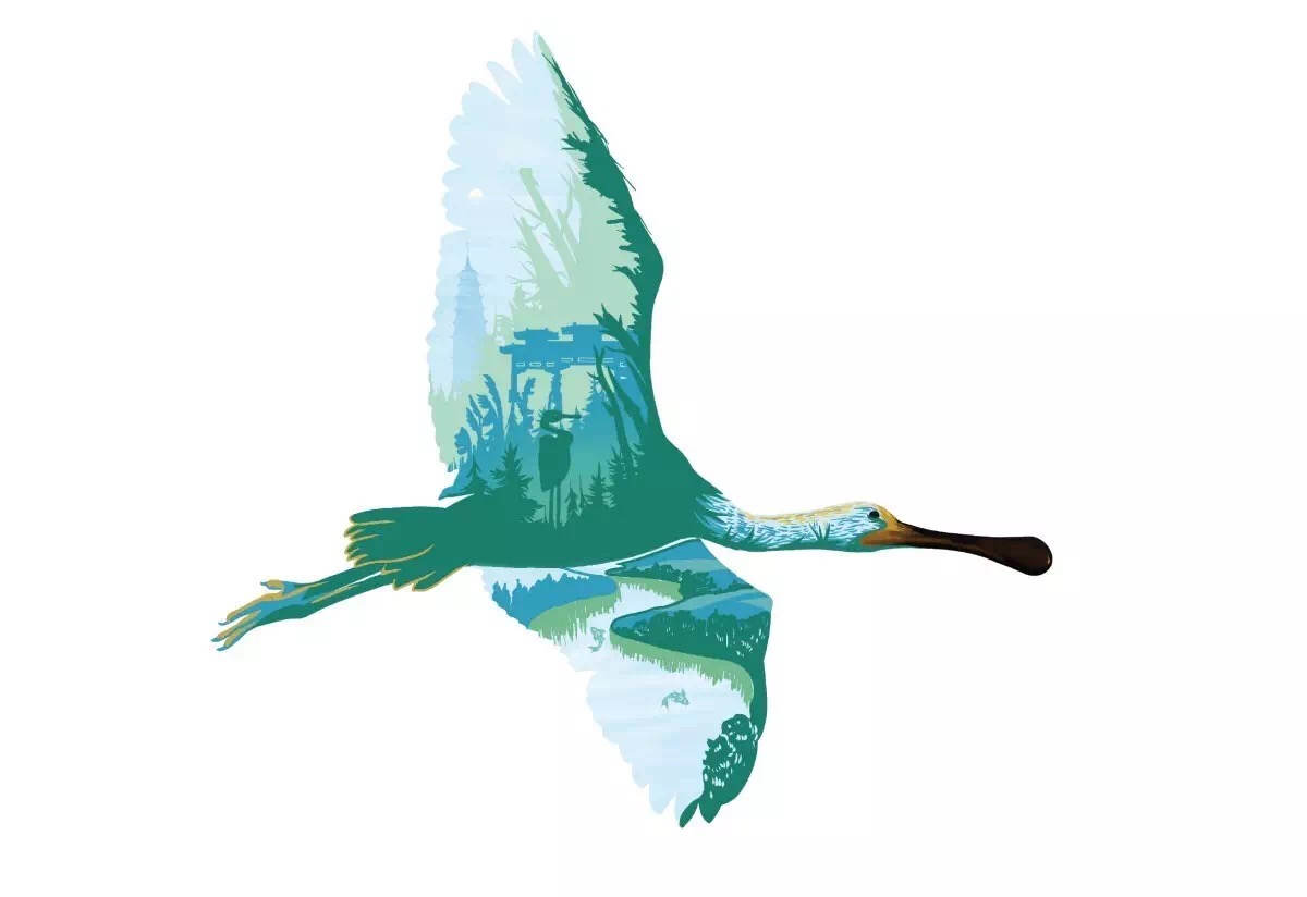 插畫創(chuàng)意,以白琵鷺為原型,將青山綠水、太湖等元素為描繪點(diǎn),繪制出生態(tài)、自然之感。通過畫面感的繪制,勾起人們對生態(tài)的保護(hù)情懷。