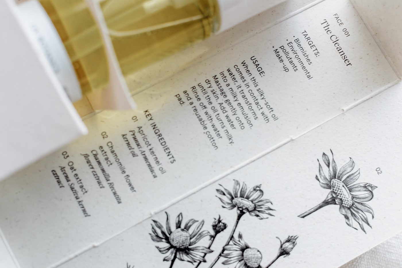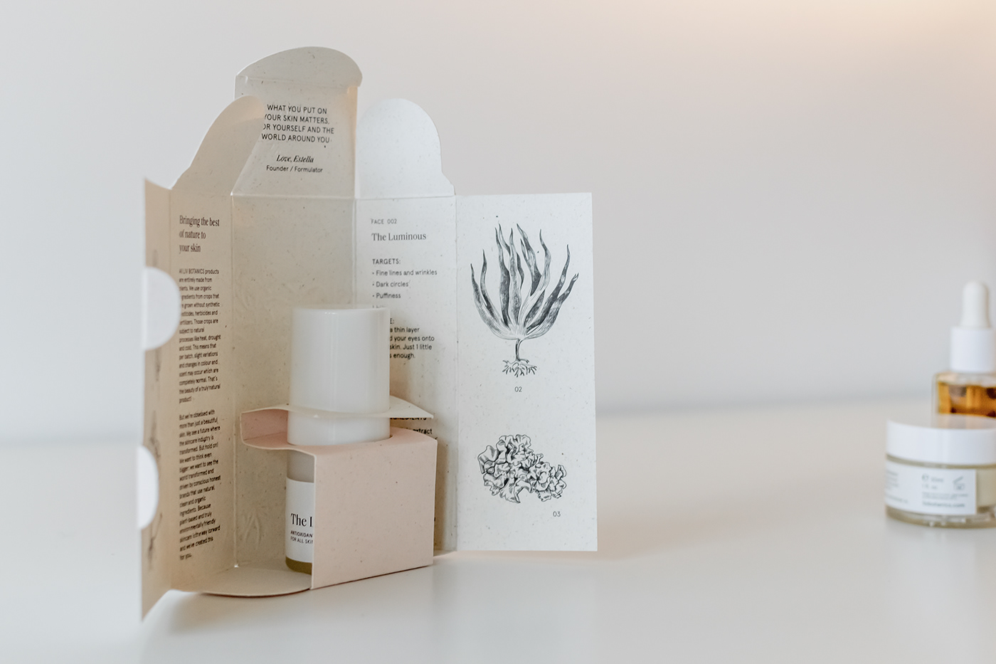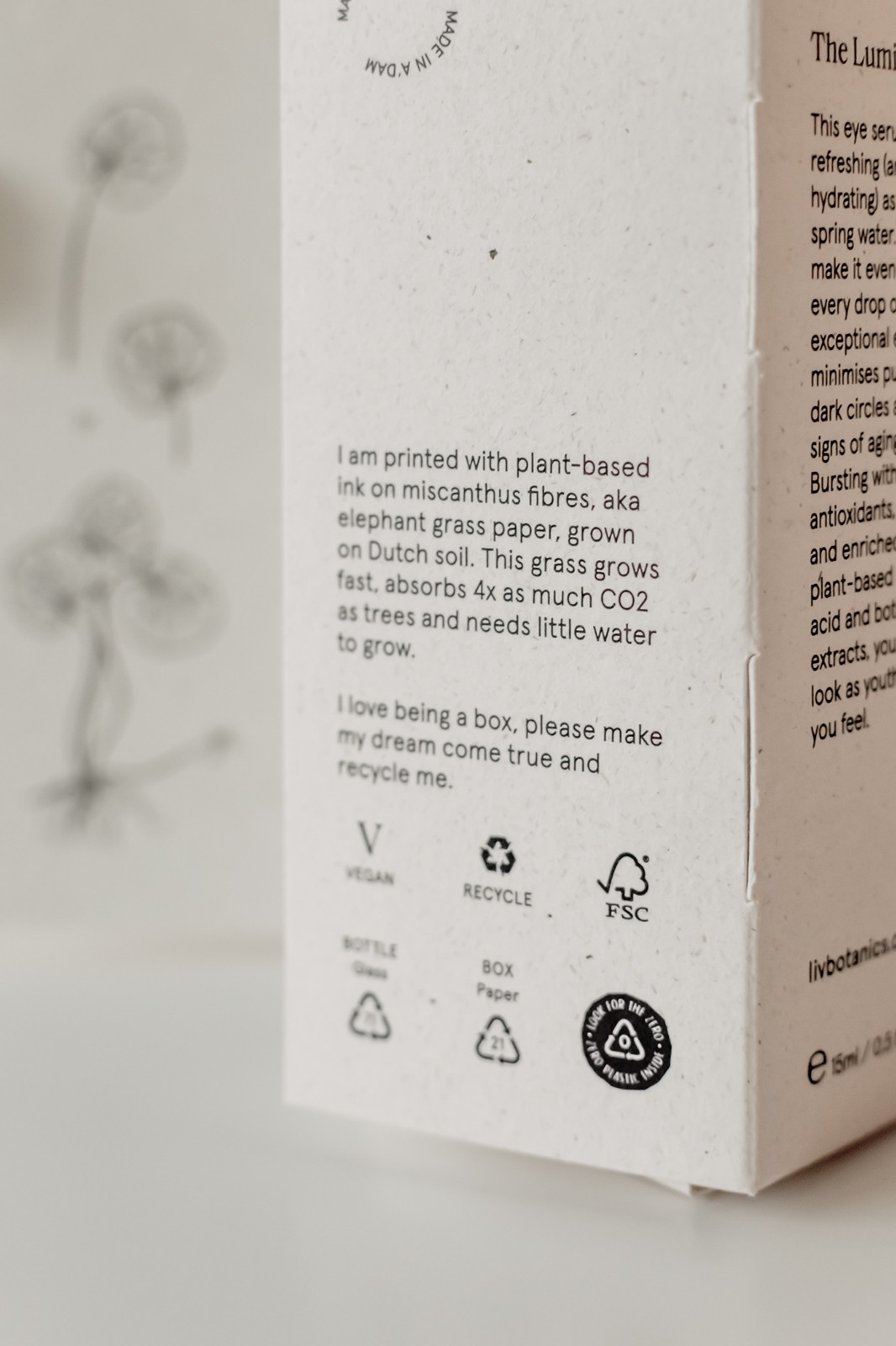 為了最大限度地減少品牌的碳足跡,我們在距離阿姆斯特丹市幾公里遠(yuǎn)的大象草纖維上使用植物基無毒墨水進行本地印刷。主包裝盒不使用膠水,展開平展,展示每種產(chǎn)品中包含的關(guān)鍵成分的植物圖及其植物名稱和信息。用于瓶子和罐子的標(biāo)簽不含塑料,而用于運輸?shù)亩壈b、紙帶和包裝紙是 100% 可回收和可回收的,并使用無毒的植物性油墨印刷。