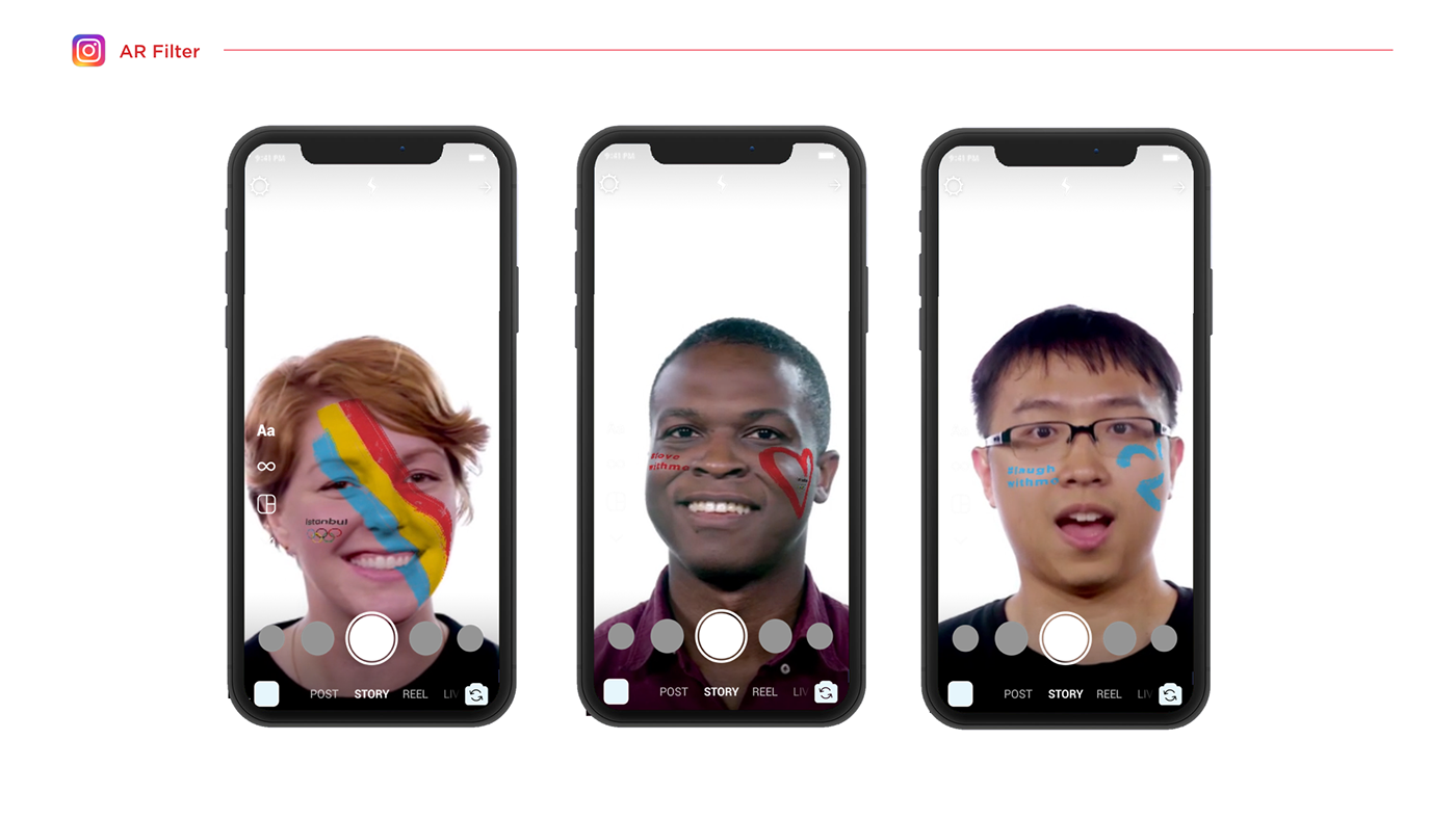 在創(chuàng)建的 Instagram 過濾器中,我們看到參加奧運(yùn)會的觀眾以不同形式的口號與我同行。