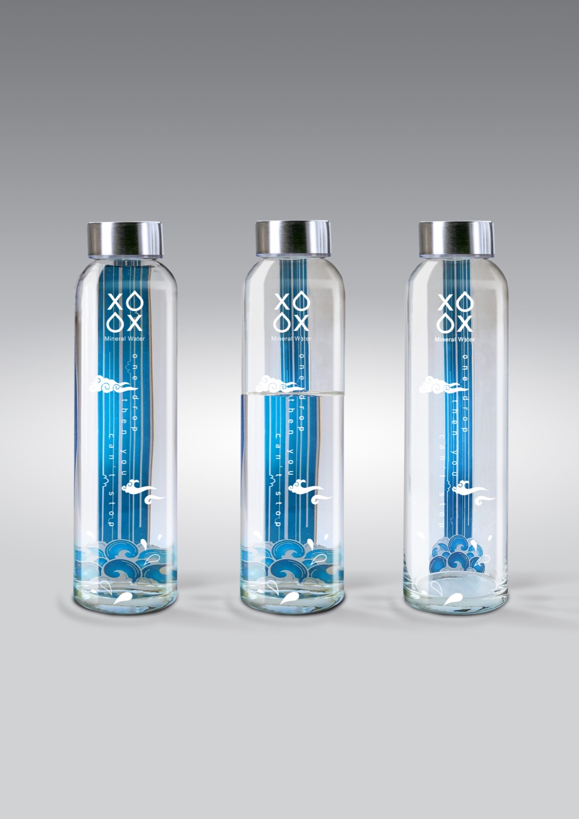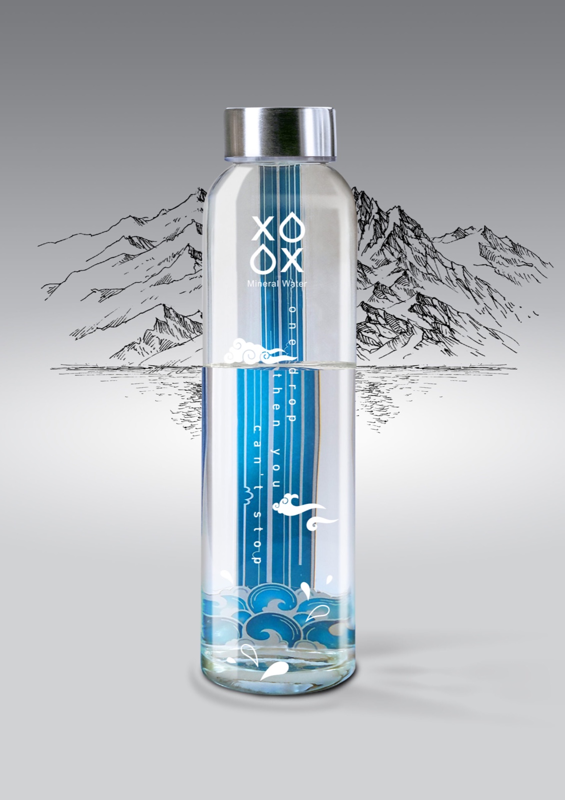 包裝設(shè)計(jì)師作者認(rèn)為礦泉水的品牌名為XO,通過(guò)將形式O轉(zhuǎn)換為水滴,X表示沒(méi)有水,以及XO的懷舊游戲,這兩個(gè)選項(xiàng)都是這個(gè)標(biāo)志的贏家,為給觀眾提供了選擇哪條道路的選項(xiàng)?. 為了設(shè)計(jì)包裝,水包裝設(shè)計(jì)師以簡(jiǎn)化的方式設(shè)計(jì)了一個(gè)靈感來(lái)自伊朗微型畫的瀑布,它被貼在玻璃背面作為雙面標(biāo)簽。瓶裝水的豐滿度以及水的折射對(duì)瀑布圖像的影響使瀑布變得越來(lái)越大、越來(lái)越寬。一起喝水會(huì)使瀑布變得更窄,水也更少。為了設(shè)計(jì)包裝,我以簡(jiǎn)化的方式設(shè)計(jì)了一個(gè)靈感來(lái)自伊朗微型畫的瀑布,它被貼在玻璃背面作為雙面標(biāo)簽。水的豐滿度和水的折射對(duì)瀑布圖像的影響使瀑布變得更大、更寬。每喝一杯,瀑布就會(huì)變得更窄,水也更少?!耙坏?,你就停不下來(lái)”的口號(hào)既強(qiáng)調(diào)了XO水的適口性,也強(qiáng)調(diào)了對(duì)這一重要儲(chǔ)備的濫用,這導(dǎo)致了一場(chǎng)環(huán)境災(zāi)難。將微型云朵放置在玻璃上,創(chuàng)造了一個(gè)帶有瀑布的三維空間。