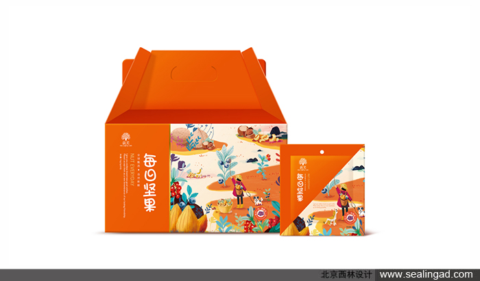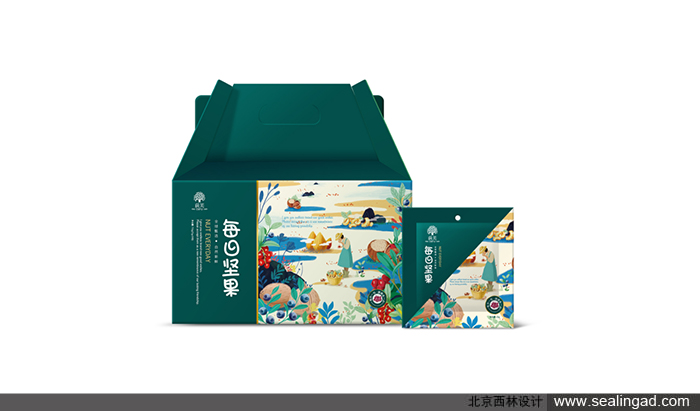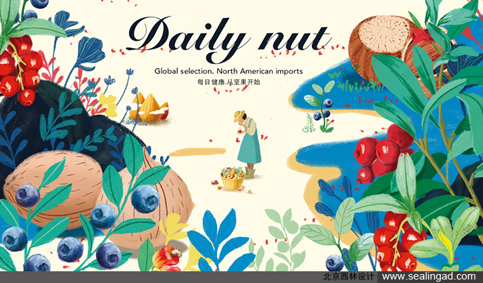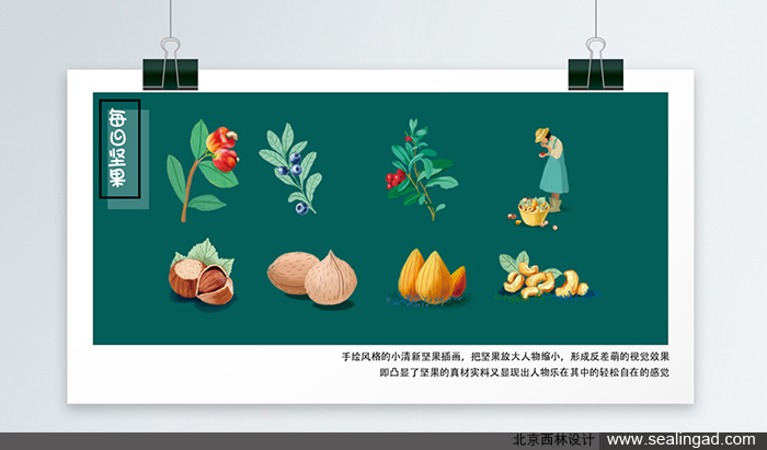 包裝插畫:手繪風格的小清新堅果插畫,把堅果放大,人物縮小,形成反差萌的禮堂效果,即突顯了堅果的真材實料,又顯現(xiàn)出人物樂在其中