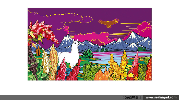 插畫整體布局采用安第斯原生態(tài)環(huán)境為背景,通過彩繪手法勾勒而成。鮮明的黃與紫的對比使畫面看起來更有沖擊力,記憶深刻。插畫元素采用安迪斯山、神鷹、駝羊、藜麥等原生態(tài)場景,通過遠(yuǎn)近虛實、等比對稱等繪制手法,