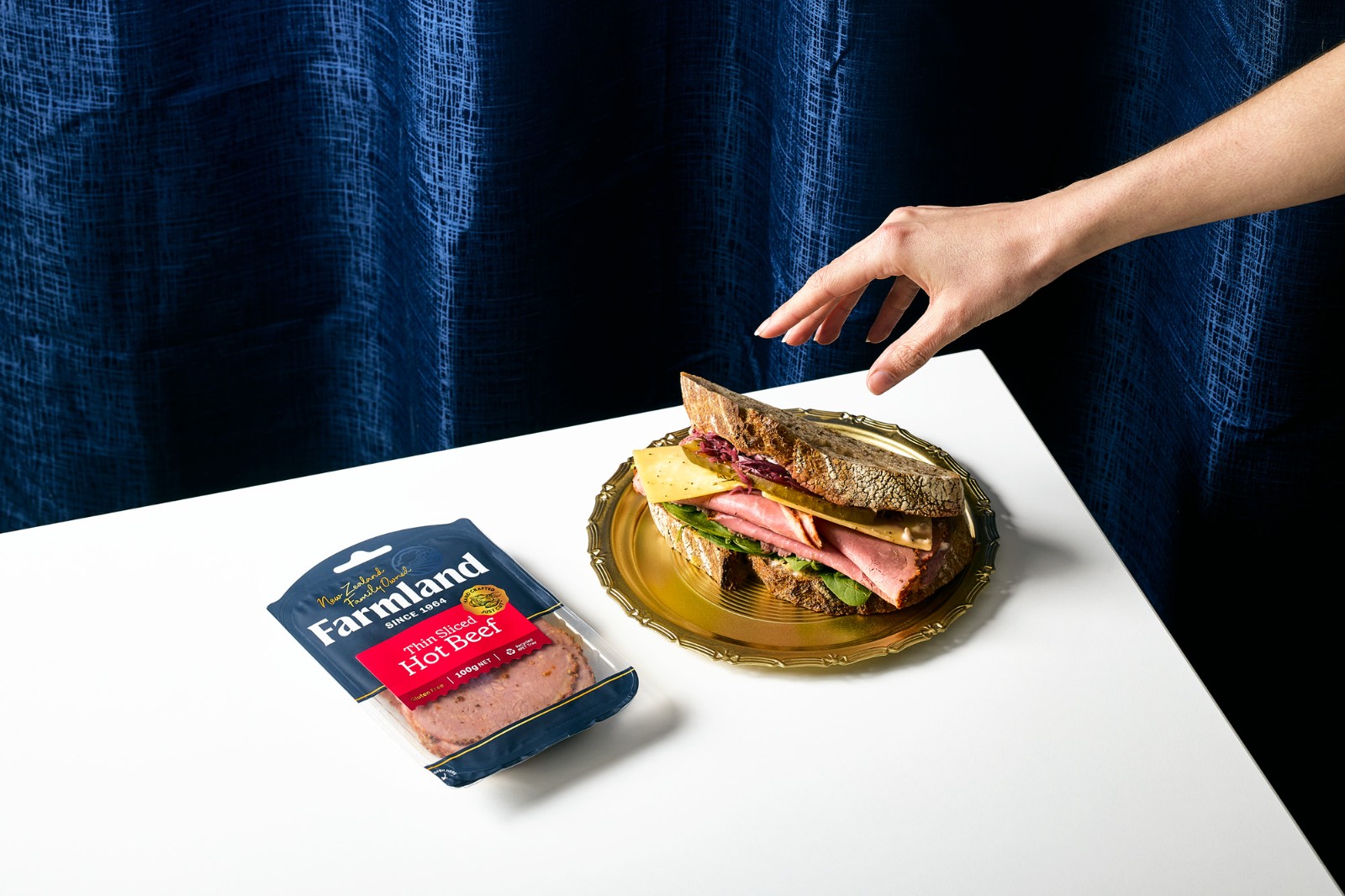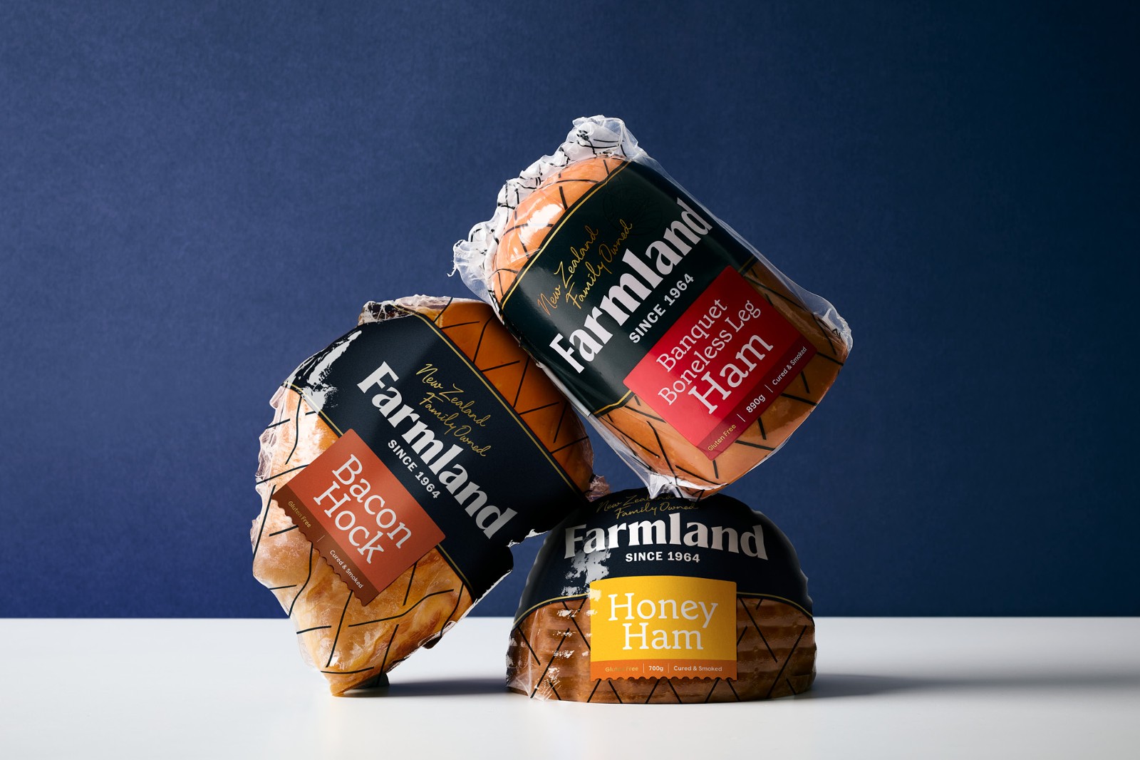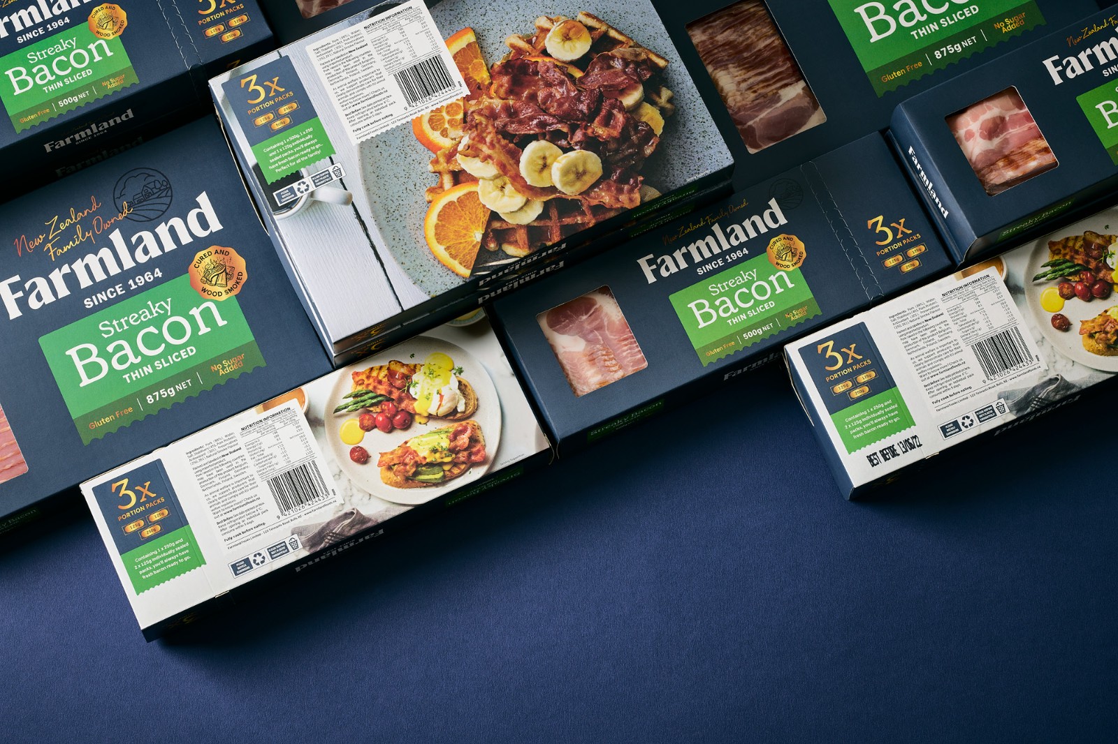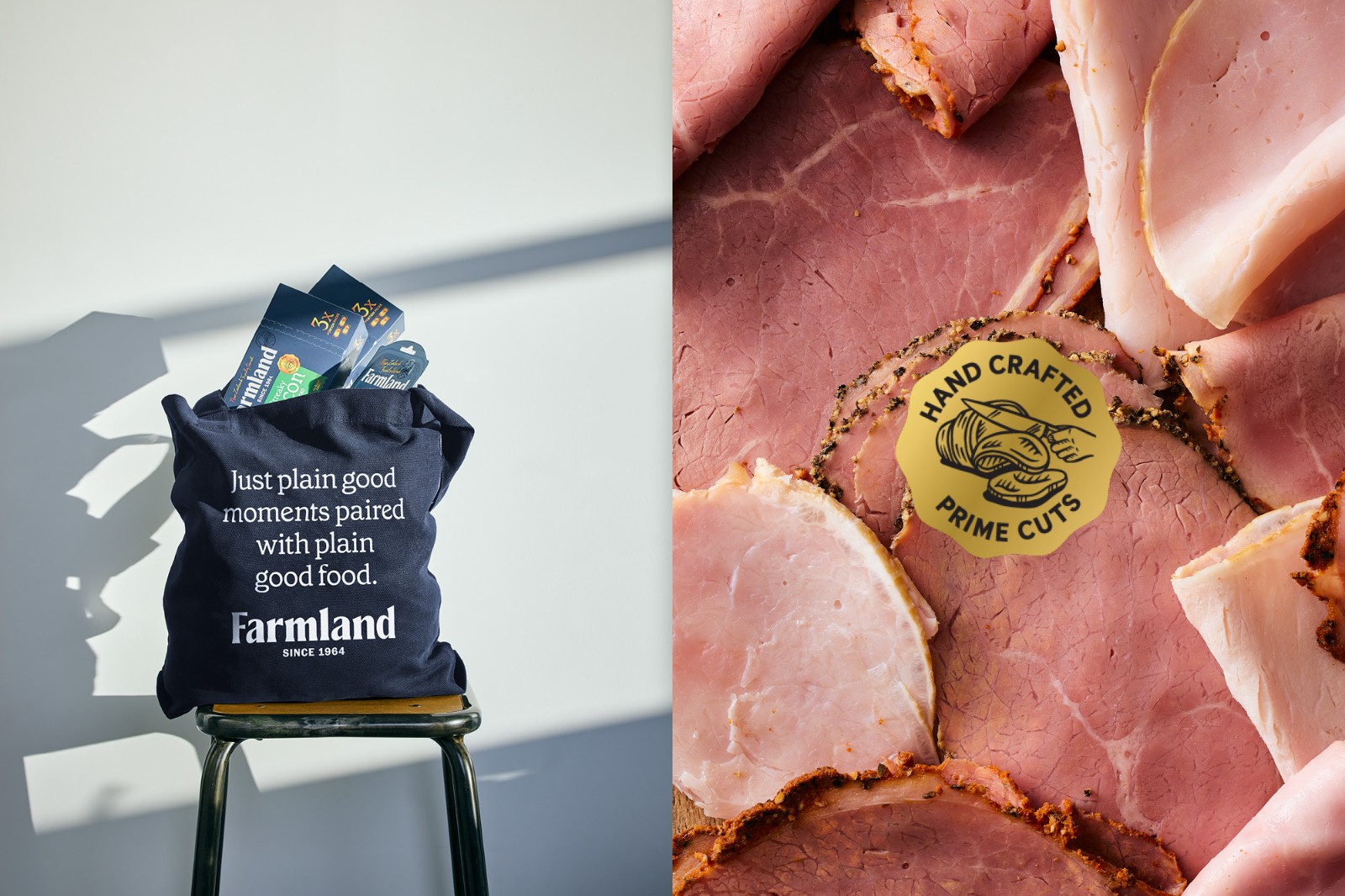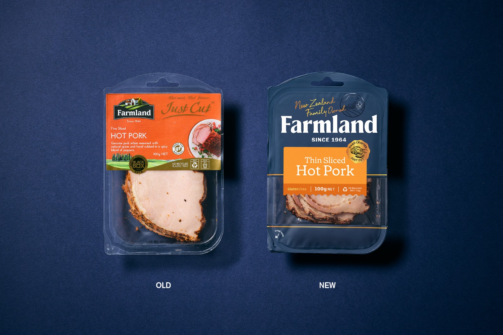 的謙遜簡約和對他們制造的產(chǎn)品的純粹自豪感來說明這一意圖。Farmland 的產(chǎn)品范圍從日常肉片、適合社交奶酪板的切塊到供全家食用的肉類。這些產(chǎn)品的碎片化造成了混亂的品牌形象,在某些情況下,品牌是如此之小以至于難以辨認(rèn)它來自何方。與其價格點的競爭對手相比,品牌屏蔽幾乎不存在。整個產(chǎn)品組合發(fā)生了巨大的變化,從家族企業(yè)檔案中的攝影和圖像目錄中獲取線索。直接取自傳統(tǒng)屠夫圍裙的豐富單調(diào)海軍藍(lán)應(yīng)用于整個產(chǎn)品組合,為了進(jìn)一步增強(qiáng)這種顏色的影響,沒有使用會阻礙或分散色塊效果的食物攝影。應(yīng)用于整個產(chǎn)品組合——與使用全彩印刷的競爭對手相比,這在所有類別領(lǐng)域創(chuàng)造了一個獨特而突出的品牌塊。
