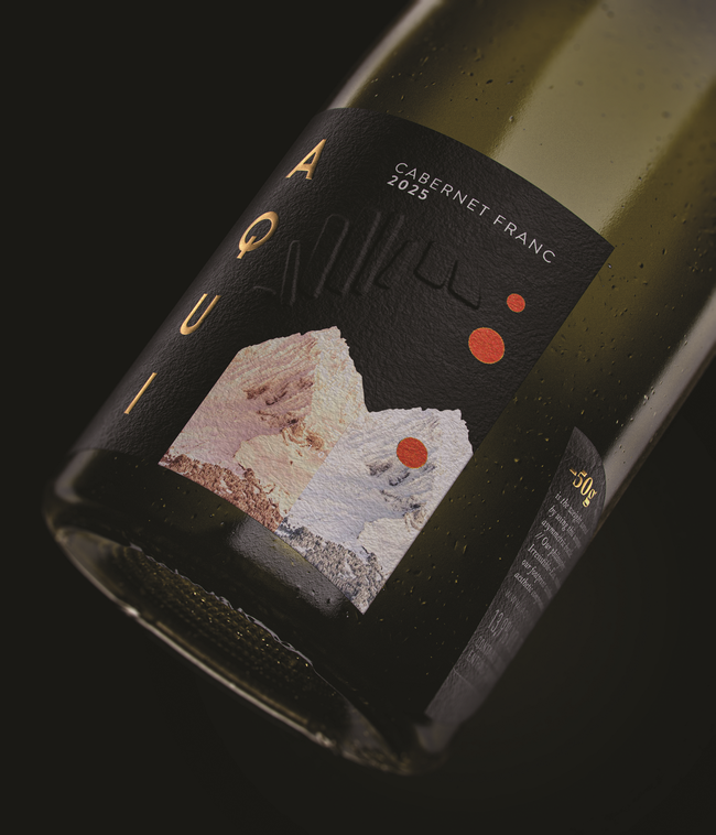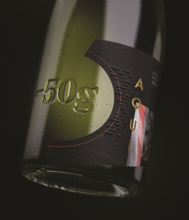 總部位于柏林的機構Ruska Martin Associates對Aqui-50g持反對態(tài)度,認為完美既不進化也不適應,因此是可持續(xù)性的對立面。設計師選擇了Estal的Prima 100%PCR Wild Glass型號,因為它的玻璃更薄,因此更輕,而且“手工制作的外觀”-50g壓印在飾面上。標簽由Fasson Cotton Extra White(Avery Dennison)制成,由于采用了模切“拼圖技術”,可以減少所需材料的數(shù)量。裝飾方面,標簽是浮雕、數(shù)字印刷和燙印的Kurz箔。瓶子頂部有軟木塞(Diam的Origin型號)和蠟膠囊。