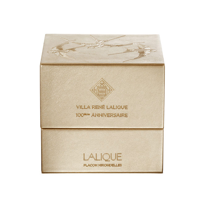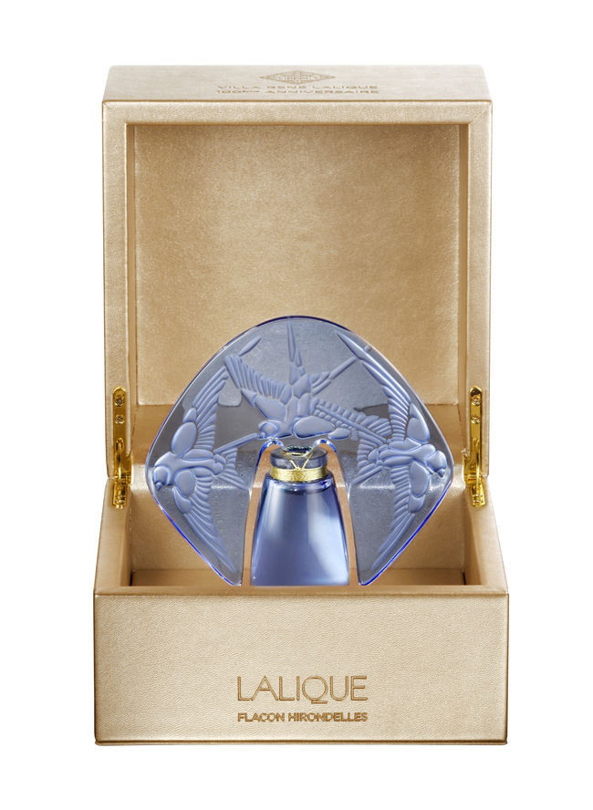 水晶制造商 Lalique 著名的 Hirondelles 香水瓶的寶藍色珍藏版慶祝 Réné Lalique 在法國 Wingen-sur-Mer 的別墅建成 100 周年。