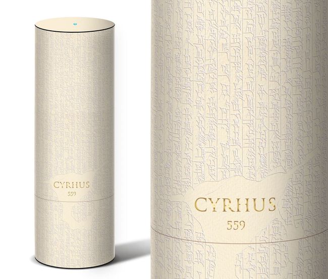 意在復(fù)制居魯士圓柱體——一種被認為是第一個人權(quán)宣言的粘土制品——帶有基座的圓柱形管體 ( Spinnler ) 由 Fedrigoni 的 Tintoretto Neve 紙板制成。該結(jié)構(gòu)有頂部和底部金屬捆扎帶,并包裹在層壓紙板中,上面印有石制品的重新轉(zhuǎn)錄。金色和藍色鍍金,飾以啞光清漆。喉高大的低開口箱體結(jié)構(gòu)可以完整地一體復(fù)制宣言。