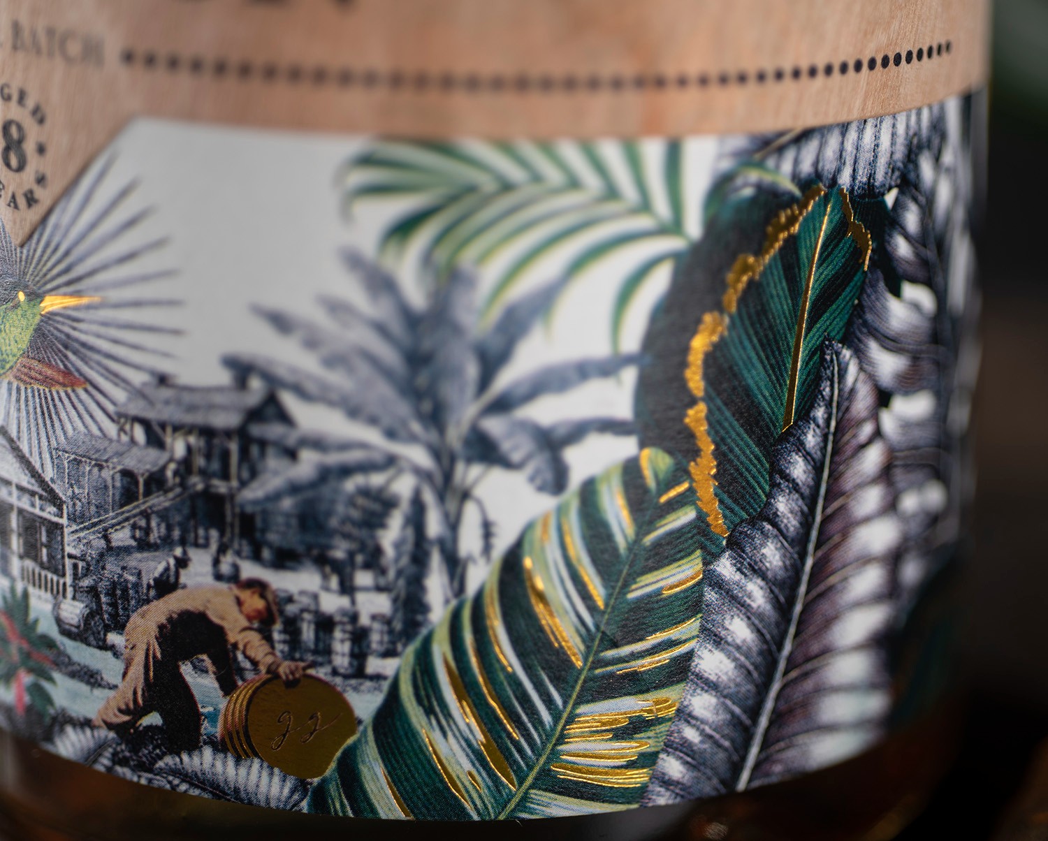 標(biāo)簽由兩張不同的紙組成,一張非常熱帶的拼貼畫,上面有典型的巴巴多斯植物和動(dòng)物,在有紋理的白紙上有殖民建筑,上面是一張寫有朗姆酒名稱和類型的木板。衣領(lǐng)因其在衰老過程中的清醒而引人注目,黑色木塞將其封閉,使其優(yōu)雅。