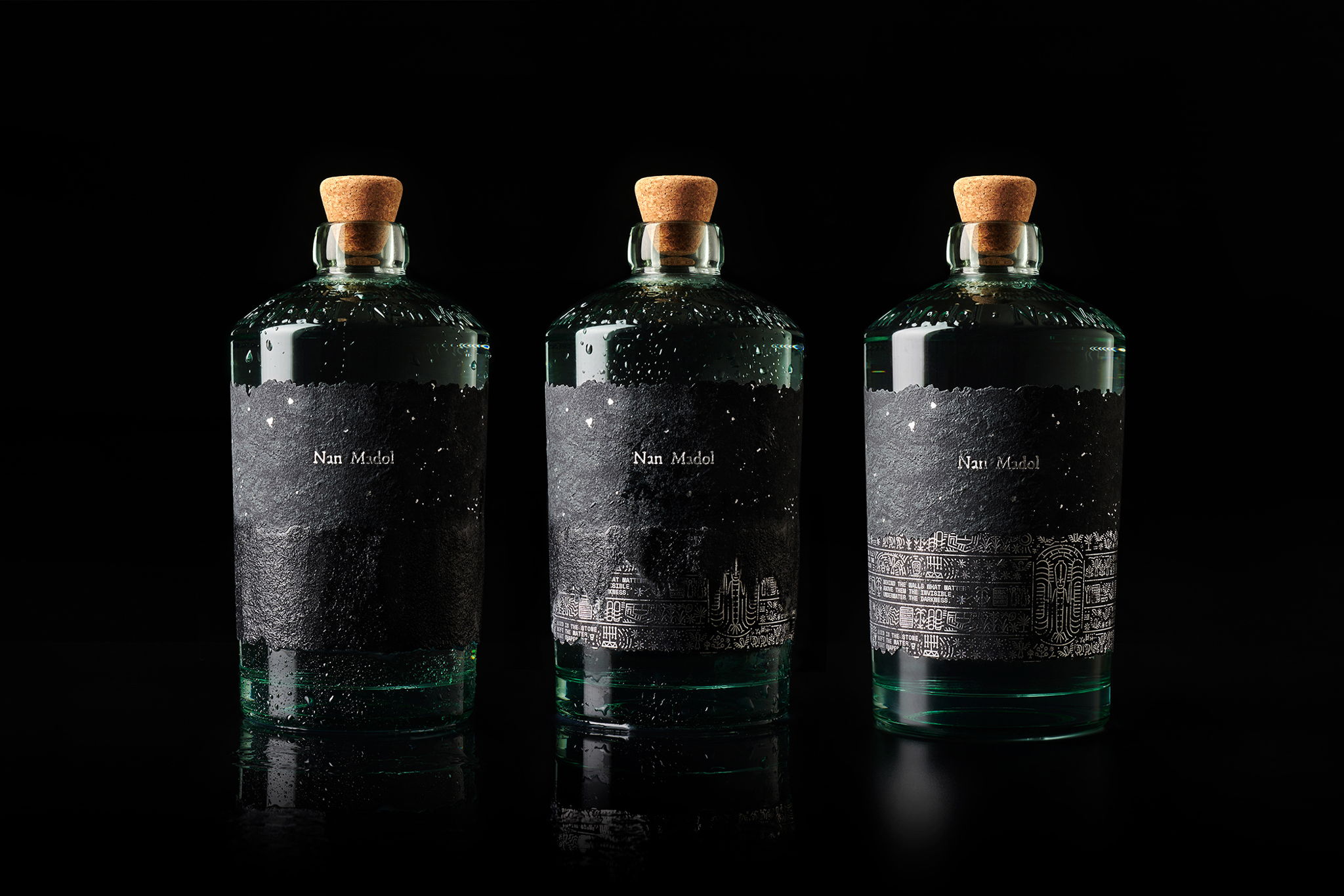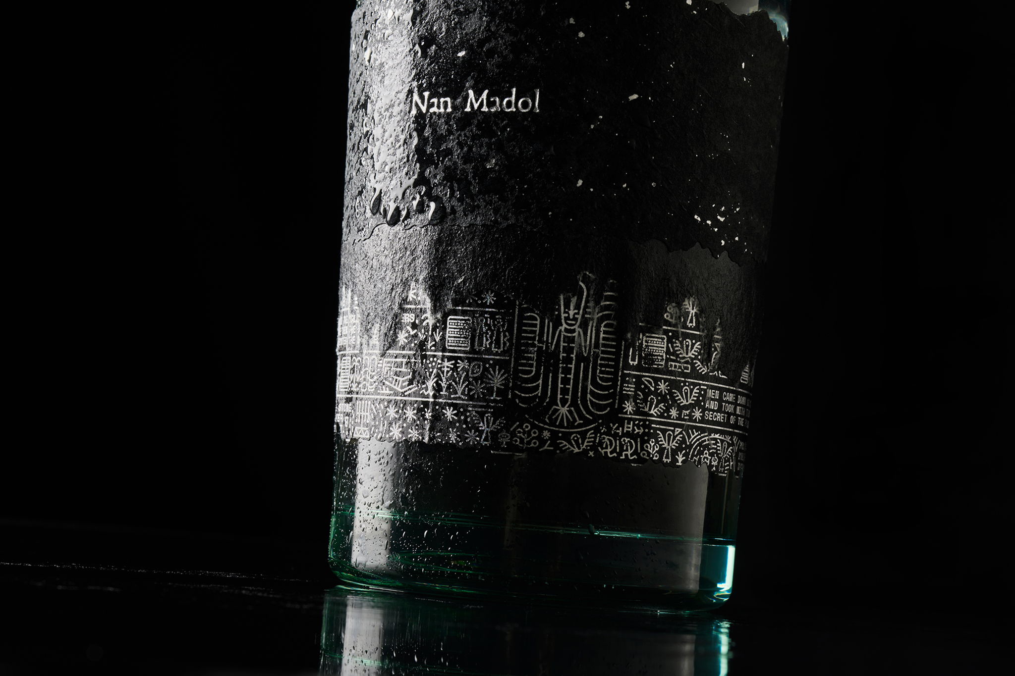 Nan Madol 的瓶子強(qiáng)調(diào)感官體驗(yàn)。由 Estudio Maba 設(shè)計(jì),瓶子的標(biāo)簽呈現(xiàn)為半浸沒狀態(tài),展示了水對石頭的影響。使用的材料、可溶解的紙、再生玻璃和紋理玻璃,繼續(xù)增加感官體驗(yàn),創(chuàng)造出一個神秘的瓶子,同時讓人感覺高貴和突出。