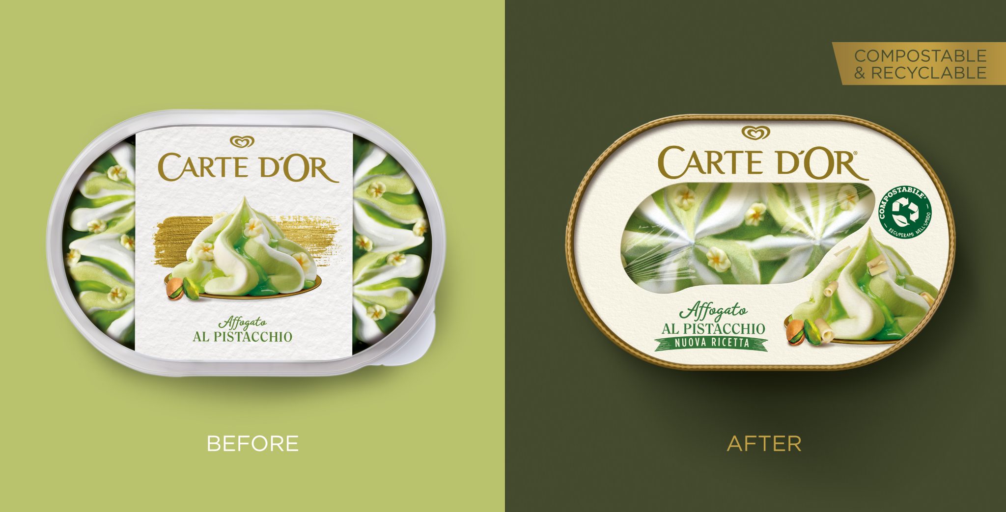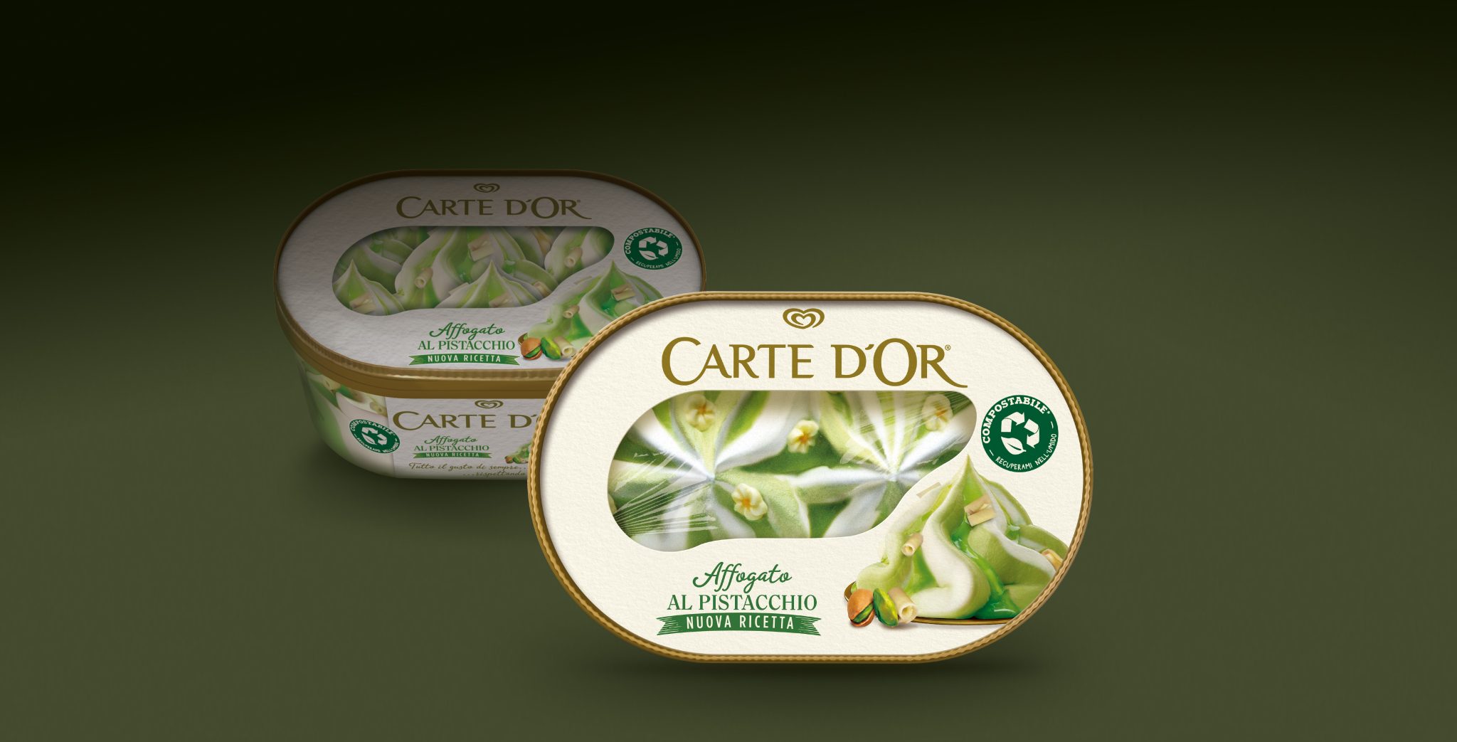 Carte D‘Or是意大利桶裝冰淇淋領(lǐng)域的領(lǐng)先品牌,其龐大的產(chǎn)品組合每年代表2500萬(wàn)件塑料包裝產(chǎn)品(1200噸這種材料)。2021年,該品牌將Carte D‘Or Affotion系列的包裝從塑料改為100%可堆肥和可回收紙張。