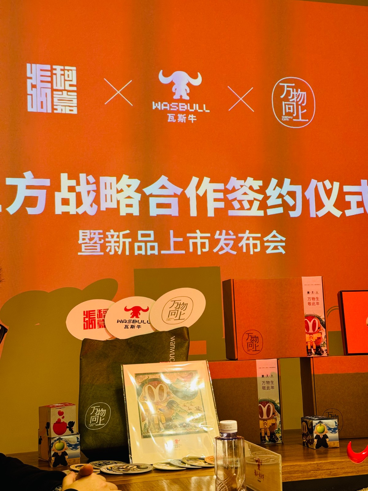 再看三方的合作布局,更是精妙絕倫。瓦斯牛位居中央,其寬闊的雙角向兩側伸展,宛如一座穩(wěn)固的橋梁,將張珂嘉品牌與萬物向上緊密相連。左側張珂嘉品牌的圖形與右側萬物向上品牌的圖形皆呈印章樣式,這印章猶如莊重的誓言,天圓地方之下,大地承載萬物,寓意著三方合作有著堅如磐石的根基以及無限廣闊的前景。