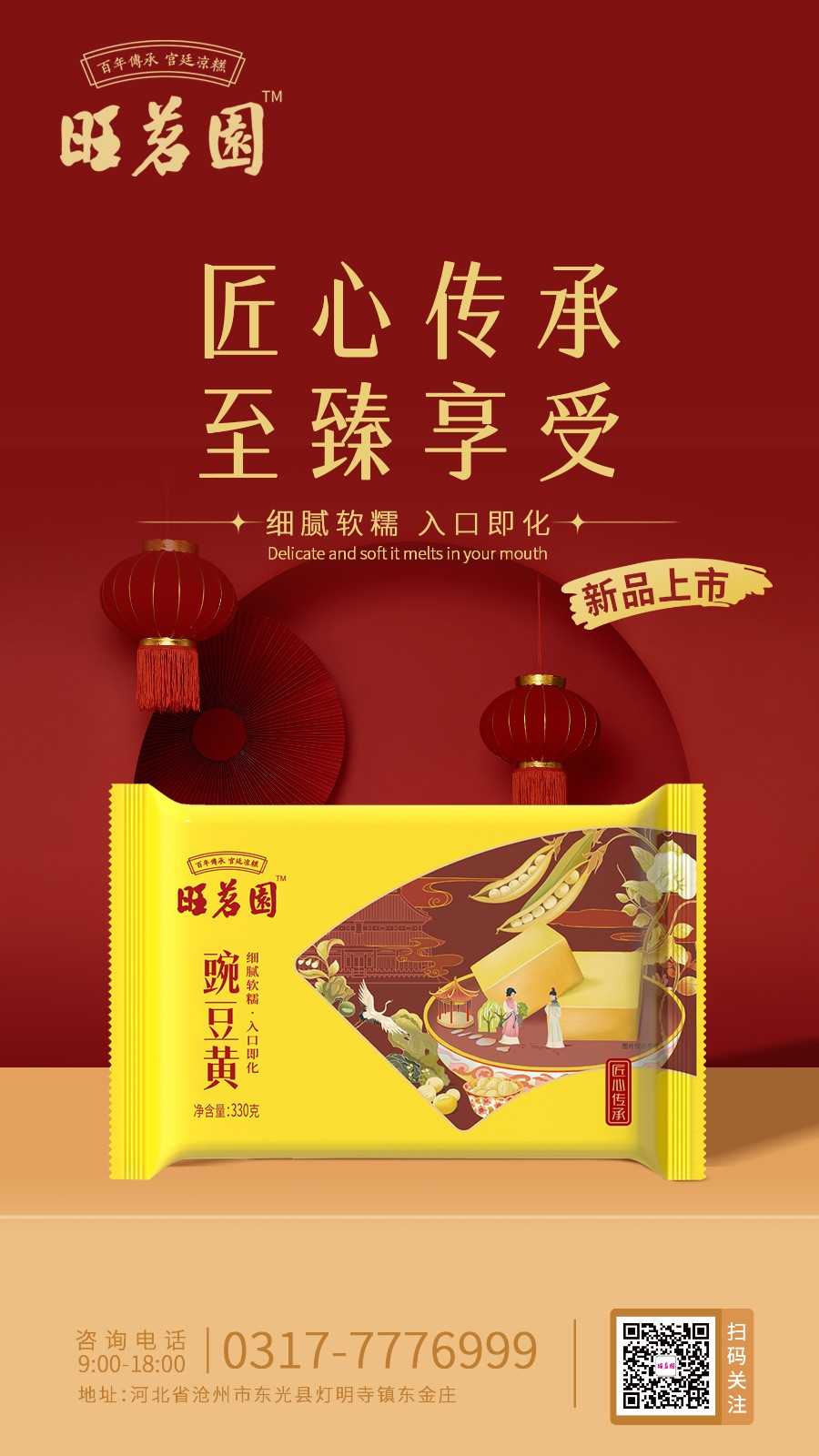 幸運源于良善,精進源于謙卑。如今,經過宮廷御膳大師傳授的旺茗園制糕手藝代代相傳,我們精選上等的豌豆、蕓豆、小豆、芝麻等原料,每一口都如絲般滑順,具有“涼而不寒,甜而不膩”的獨特口感。結合現代科技超低溫鎖鮮技術,保留食物最初的新鮮,讓傳承百年的時令美味跨越時間與地理因素的桎梏,可隨時隨地隨心來一場味蕾上的邂逅。