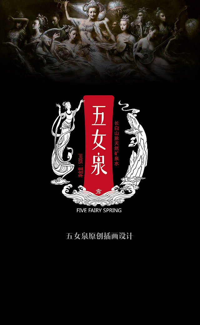 五女泉插畫是以古典仙女為原型,形成五種神情各異的插畫風格,插畫元素以仙女、山峰、水為主題,直接表達出產(chǎn)品特性。水為萬物之源,居于底部,闡述一種生命起源之感,以水為依,山石而起,構(gòu)成山水相依之美感,五女峰由五仙女幻化而來,加入仙女飛天元素,加強視覺意境。