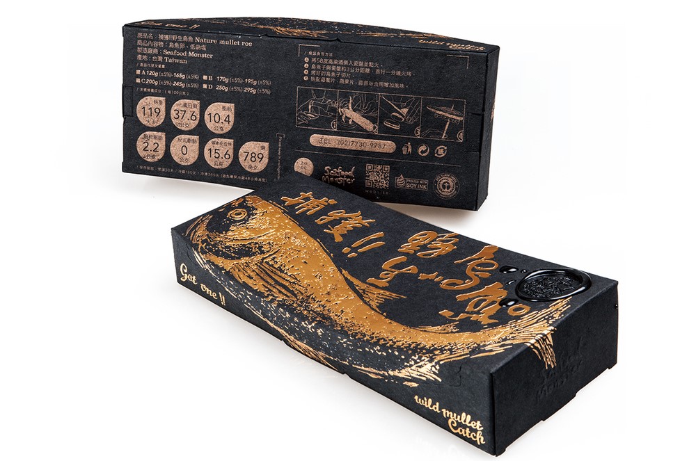 野生烏魚因其黑色背面而得名,因?yàn)榕_(tái)灣的“吳”一詞有“黑”的意思。在冬季,每年都是野生烏魚的季節(jié),沿海的漁村被鋪上曬干的烏魚魚子的金色光芒所覆蓋。這就是為什么烏魚魚兒也被稱為海中的黑色黃金的原因。這意味著它對(duì)臺(tái)灣和中國(guó)大陸的烏魚產(chǎn)業(yè)所具有的經(jīng)濟(jì)地位?!俺尸F(xiàn)的一種烏金的視覺,劉經(jīng)緯以魚拓藝術(shù)形式將產(chǎn)烏魚的形體,在視覺上非常的突出。他這套包裝讓臺(tái)灣文化與民眾生活躍上國(guó)際視線。曾獲得2015的紅點(diǎn)獎(jiǎng)。