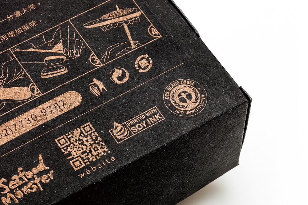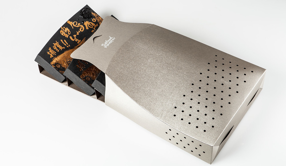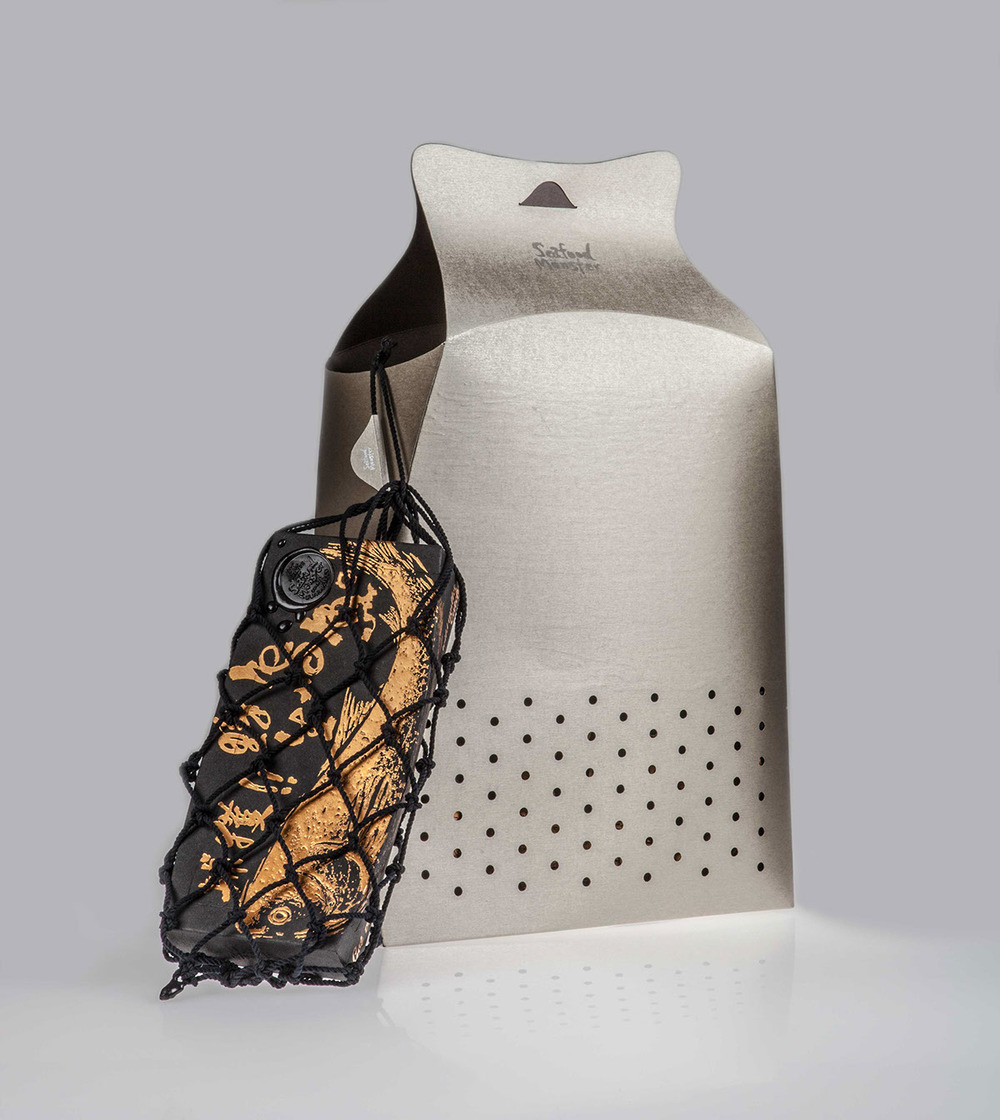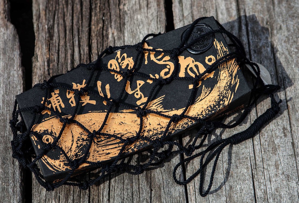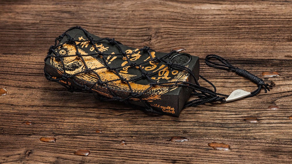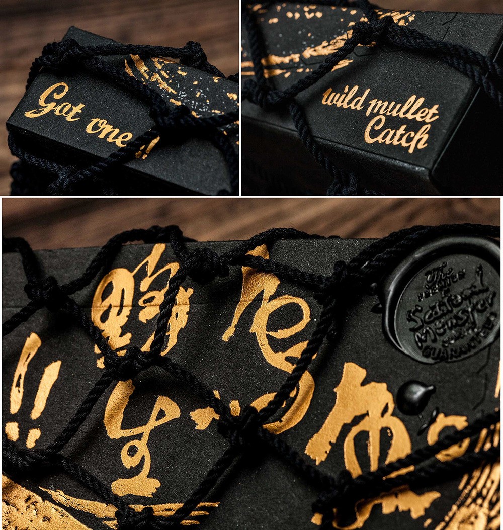 整個(gè)包裝北京設(shè)計(jì)小編認(rèn)為絕對(duì)顛覆了對(duì)腥味濃重的烏魚包裝的刻板印象,黑色與金色的搭配,火漆印章和漁網(wǎng),讓你分分鐘感受傳統(tǒng)與高端。在色彩上,黑盒做出來的也是再生紙,盒體視覺效果都很有手工打造的感覺,當(dāng)消者使用該產(chǎn)品,并從漁網(wǎng)形狀的盒子中,打開取出產(chǎn)品時(shí),他有一類似于親自體驗(yàn)捕魚的喜悅,此包裝盒的底部設(shè)計(jì)用測(cè)量線,以方便烏魚子的切片燒制時(shí),廚師可以自由切割各種尺寸的魚片。野生烏魚,從自然界中獲取,同生互存的概念,循環(huán)及環(huán)保的包裝理念。佳節(jié)伴手禮的好選擇。