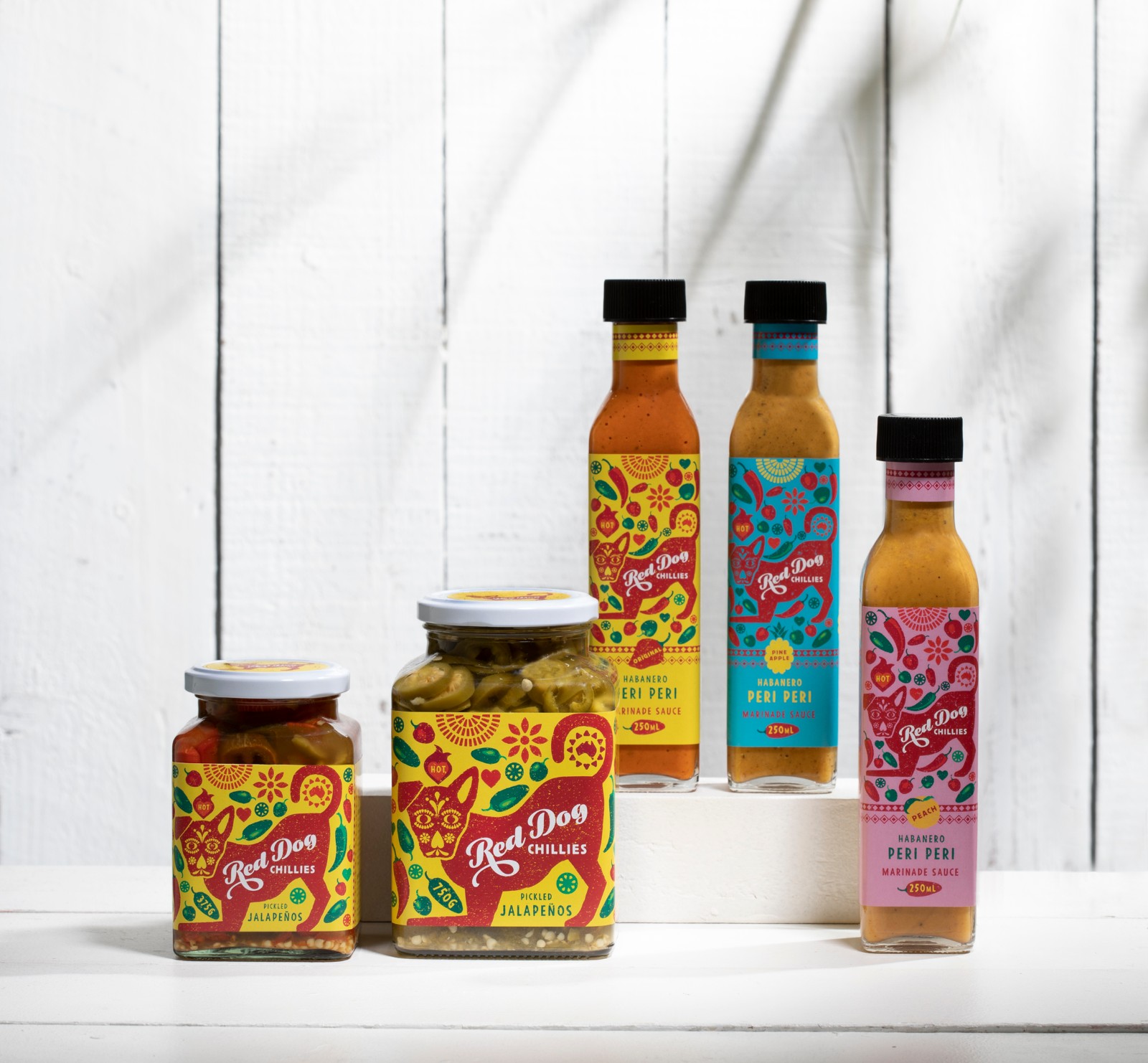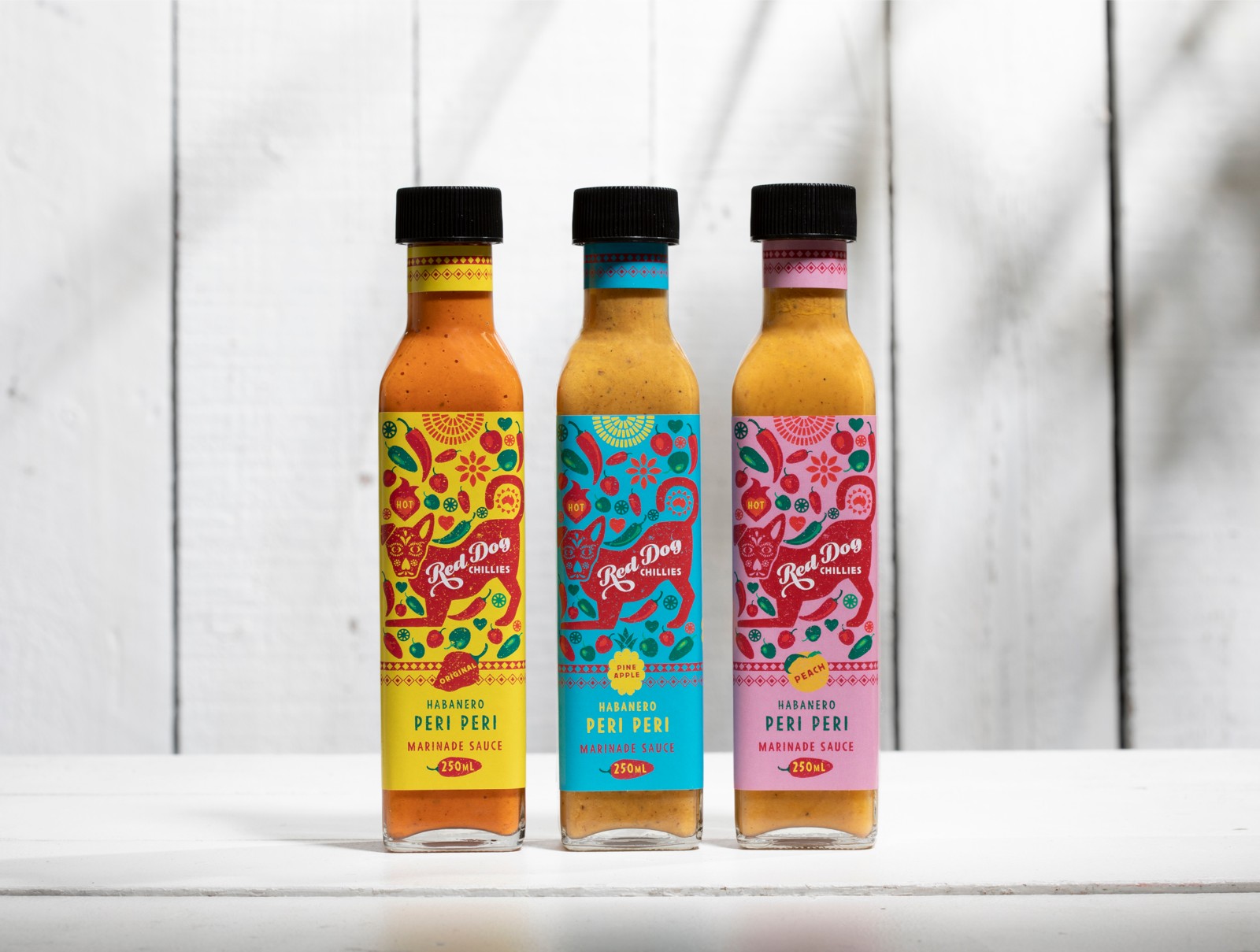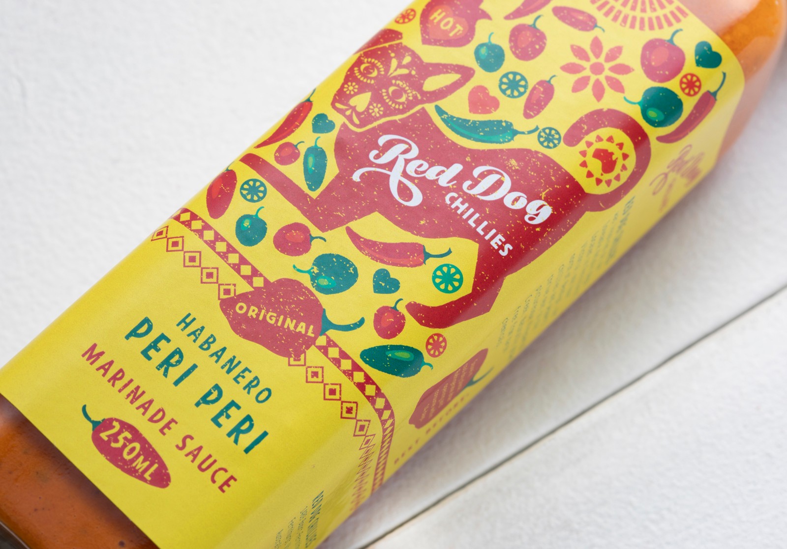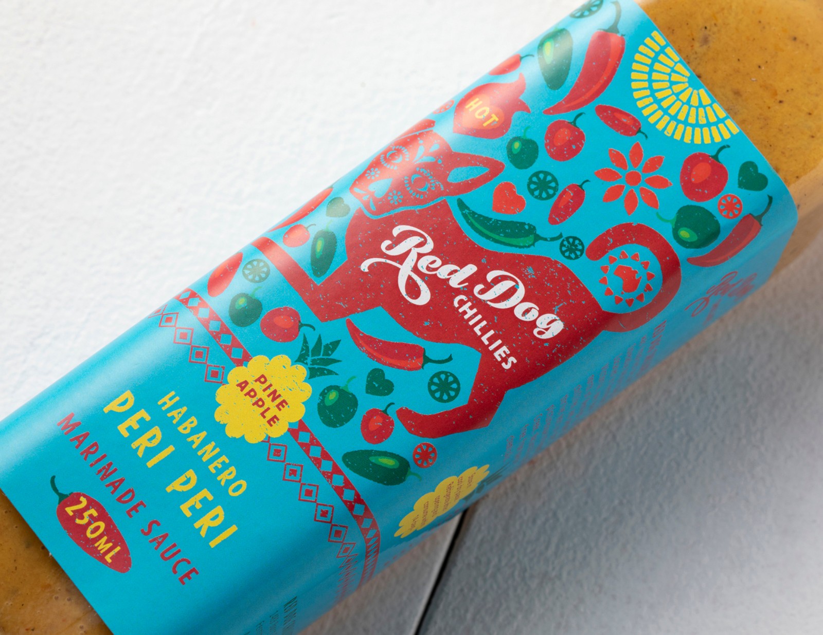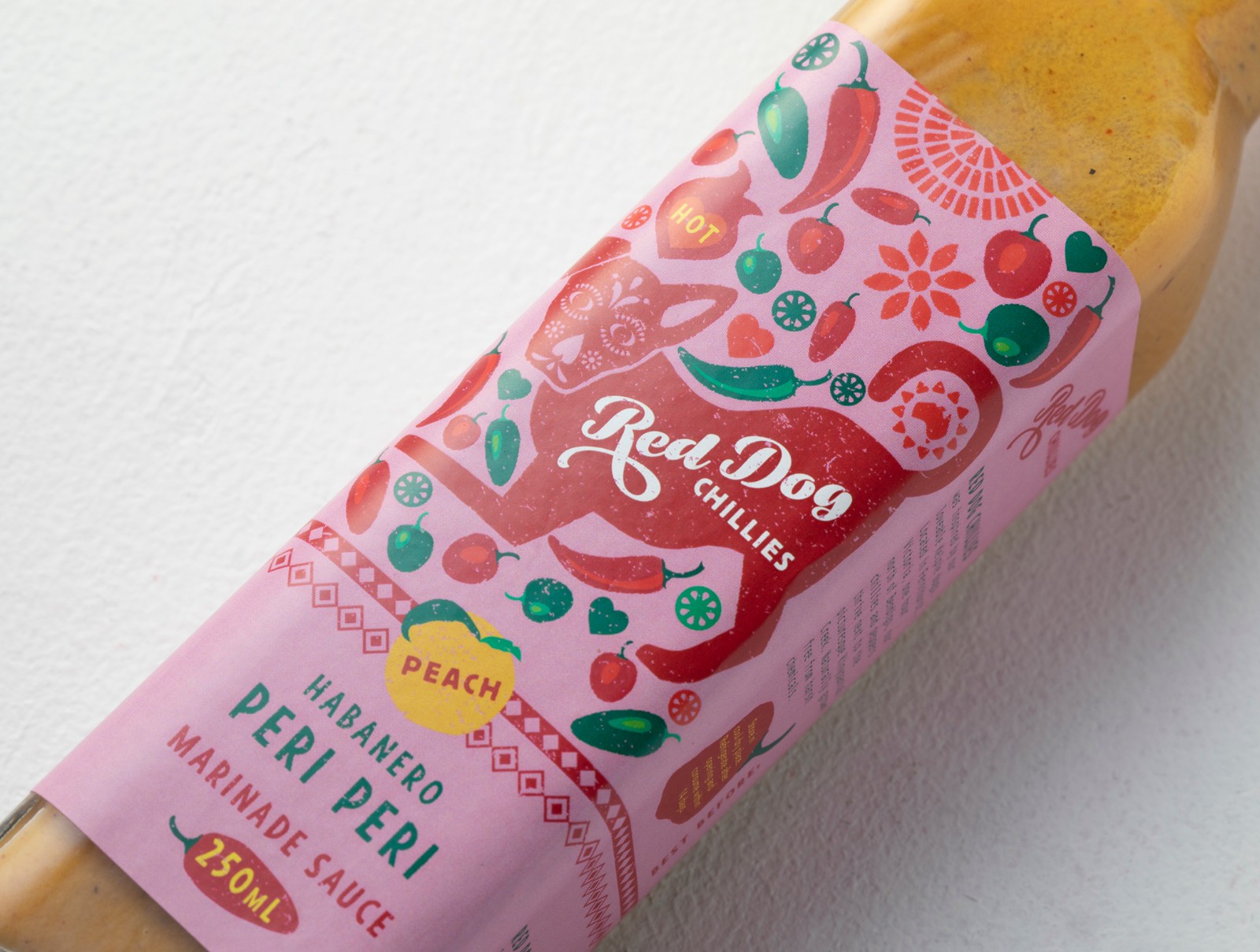 紅狗辣椒(Red Dog Chillies)需要重塑品牌,以展示其優(yōu)質(zhì)產(chǎn)品并吸引新的消費者興趣。他們的老品牌并沒有傳達出店內(nèi)真實,炙手可熱的美味。為了與墨西哥風(fēng)味的辣醬和墨西哥胡椒保持一致,我們采用了墨西哥的“街頭食品”主題。他們心愛的“紅狗”蜿蜒在農(nóng)場周圍,在標簽上占據(jù)著中心位置。紅狗上裝飾著“死亡之日”口罩,標簽上散布著許多品種的辣椒。該標簽還有其他故事講述的圖像–太陽,這是辣椒成功生長的關(guān)鍵因素,并且以圖形方式傳達這是澳大利亞的產(chǎn)品。墨西哥設(shè)計模式增加了墨西哥主題。醬汁范圍內(nèi)共有三種口味,每種口味都有不同的顏色。