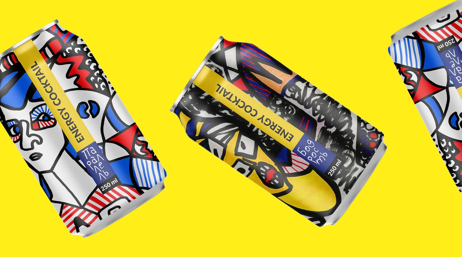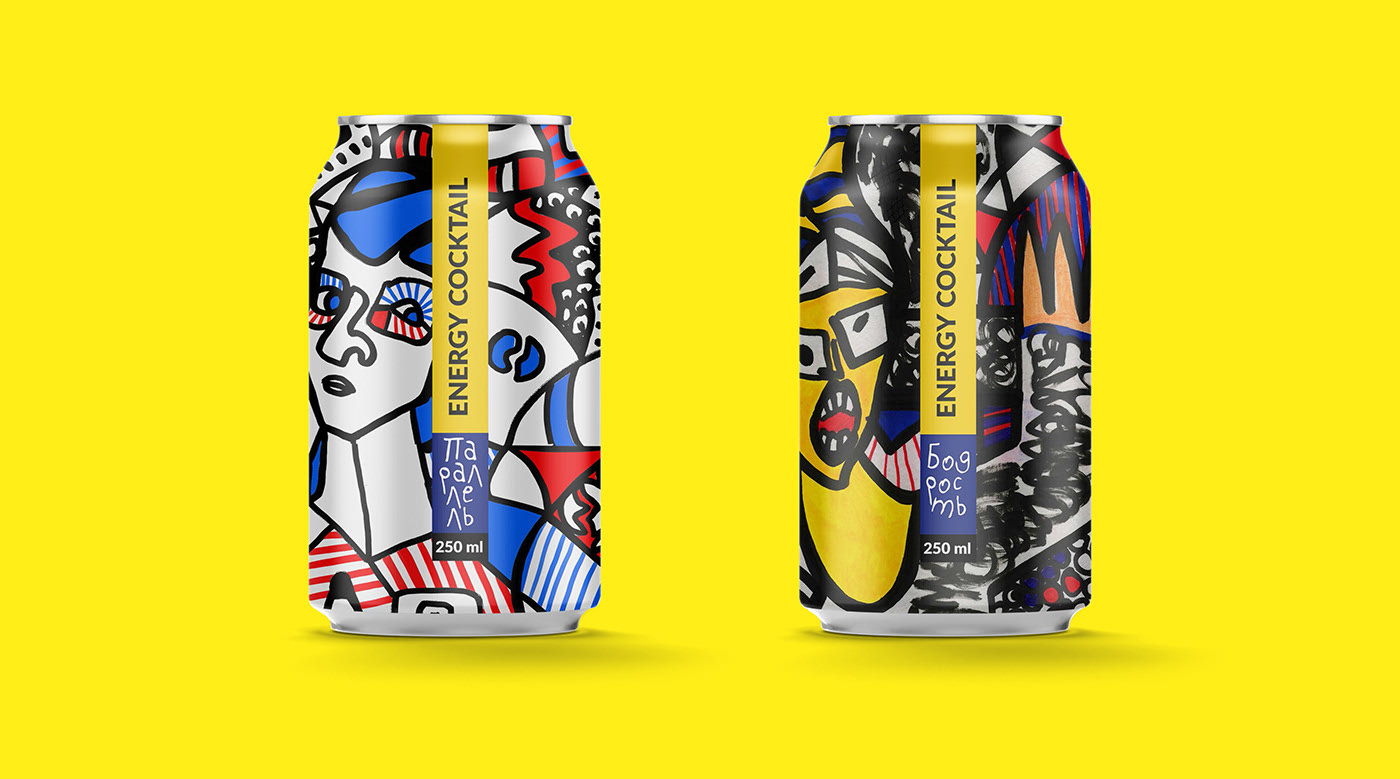 Energy cocktails: "Parallel" and "Cheerfulness". The packaging design is based on a portrait stylized for Jean-Dubouffe and Jean-Michel Basquiat and emphasizes the energy component of the drink.