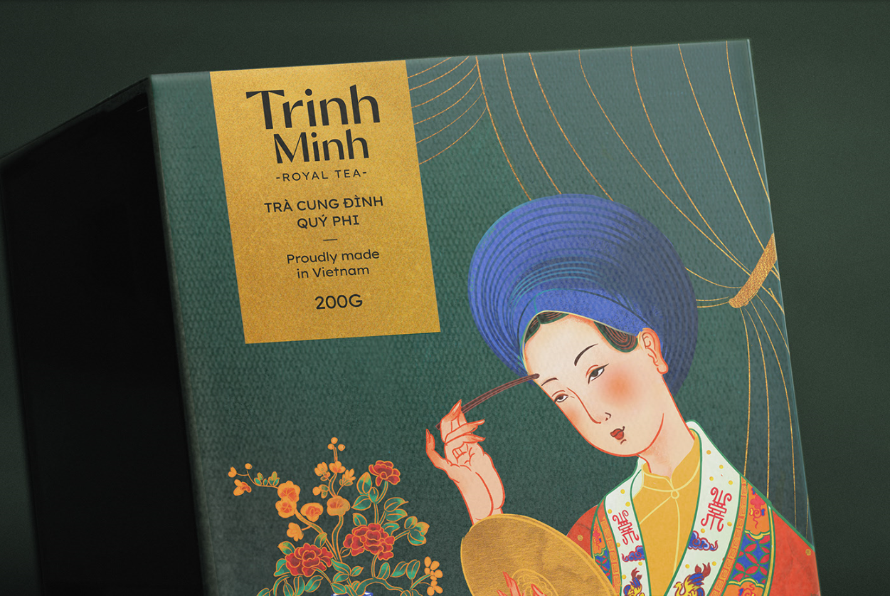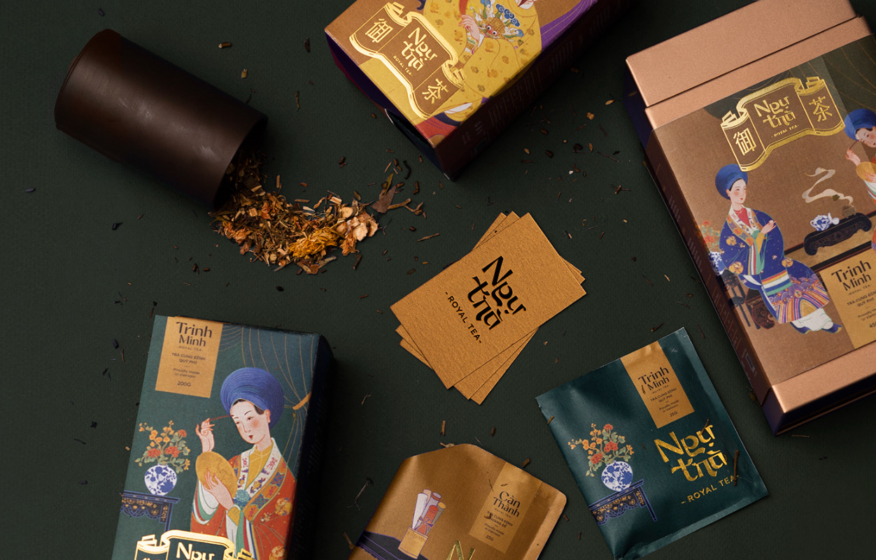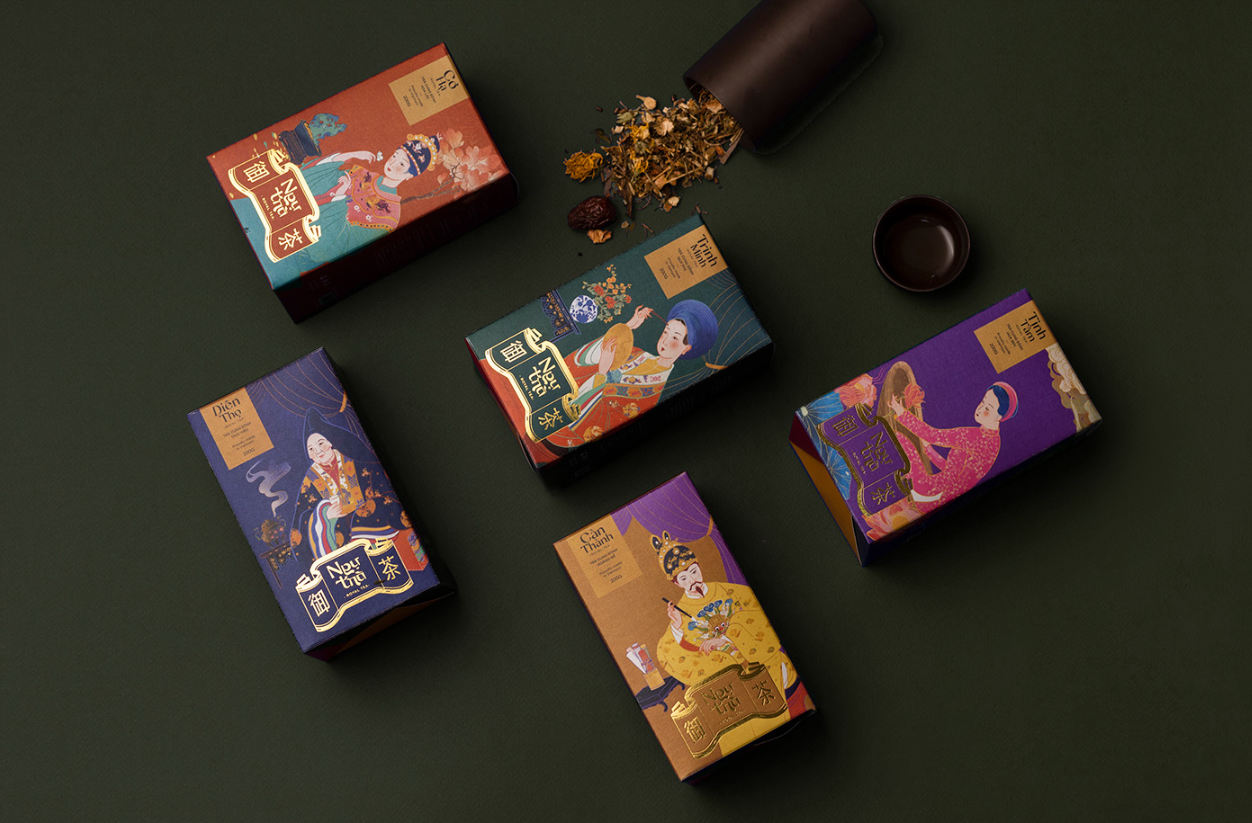 “Ng?Trá”的包裝靈感來源于皇宮——皇妃們居住的天明宮、帝國下榻的燦丹宮和王母娘娘下榻的奠陀宮。對(duì)于荷花和茉莉花茶,我取了順化宮著名的地方:天潭湖和可可哈花園。我還為這五種不同的茶制作了一系列的插圖,它們的靈感都來自皇家色調(diào)。