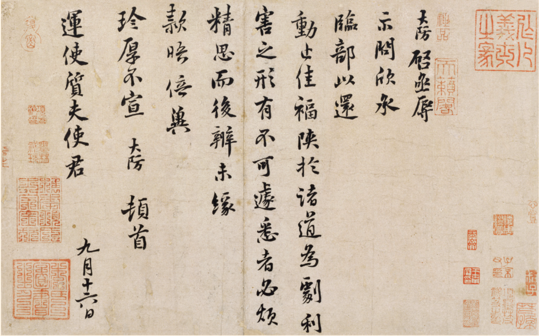 傅堯俞(1024-1091),字欽之,北宋官員,鄆州須城(今山東東平)人。蘇軾謫居黃州時(shí),傅堯俞遣使者來(lái)看他并求新近之作,蘇軾親手書(shū)寫(xiě)《赤壁賦》為贈(zèng),并在跋中寫(xiě)道:“軾去歲作此賦,未嘗輕出以示人,見(jiàn)者蓋一二人而已。欽之有使至,求近文,遂親書(shū)以寄。多難畏事。欽之愛(ài)我,必深藏之不出也,又有《后赤壁賦》筆倦未能寫(xiě),當(dāng)候后信。軾白?!薄墩綮厶肥歉祱蛴醾魇滥E孤品,系致友人應(yīng)酬問(wèn)候的短札。