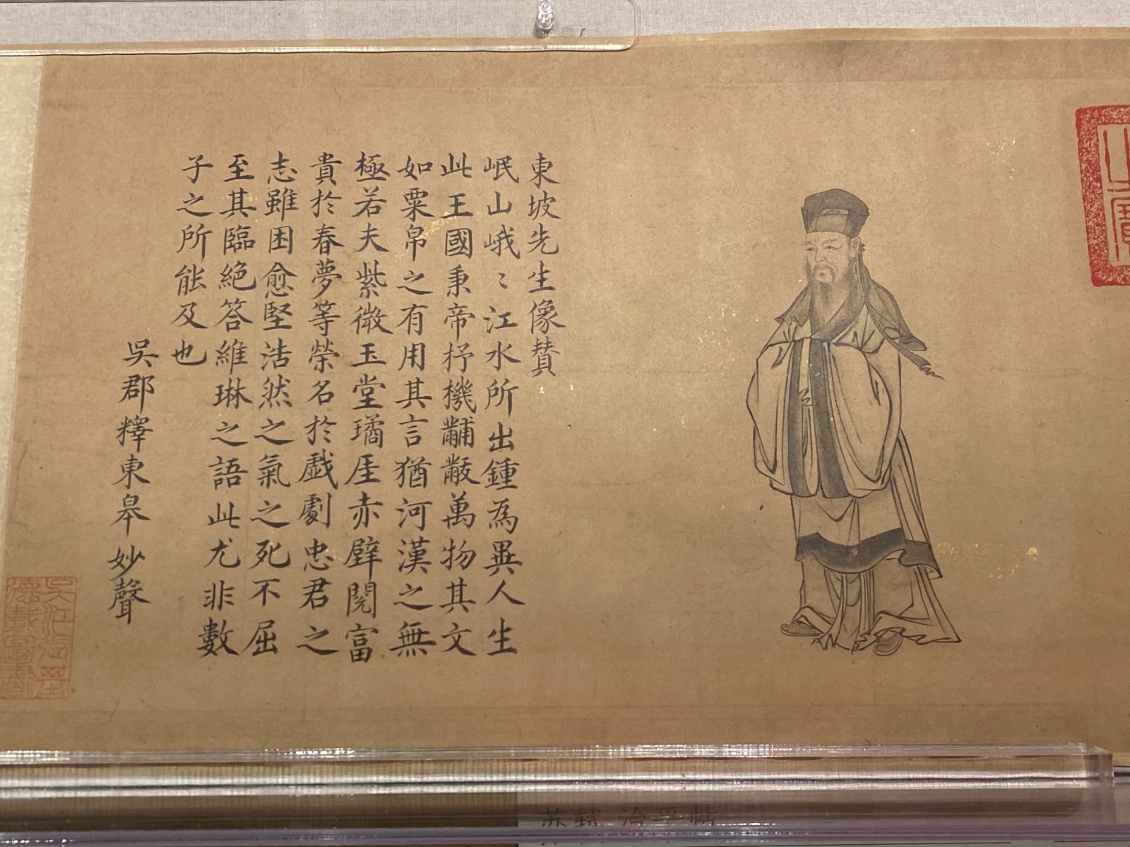 標(biāo)題“千古風(fēng)流人物”從《答謝民師論文》、《姑孰帖》(本次展覽展品)、《前赤壁賦》中集字而來(lái),均為蘇軾本人所書(shū),縱貫畫(huà)面、一氣呵成,且與畫(huà)作渾然一體。