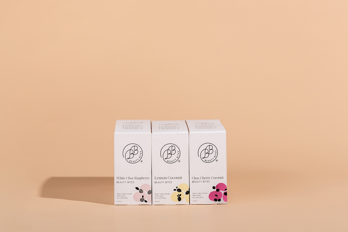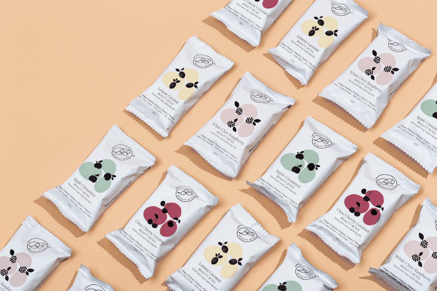 借助現(xiàn)有徽標,我們從零開始開發(fā)了Beauty Bites品牌,將其以當(dāng)代的清新氣息為基礎(chǔ),并將這種感覺注入了一切。我們設(shè)計的包裝具有定制插圖(從配料中汲取靈感)作為產(chǎn)品的差異化特征,并配以簡單精致的版式,以進一步向美容行業(yè)致敬。