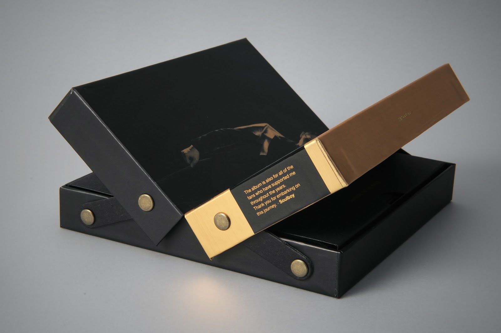 這款禮盒包裝工藝就相對更復(fù)雜,在表面用防蠟銅字,而且是采用凹凸雙層裱,工藝復(fù)雜,有燙金,旁邊還加金屬扣,黑色禮盒上更加體現(xiàn)高貴