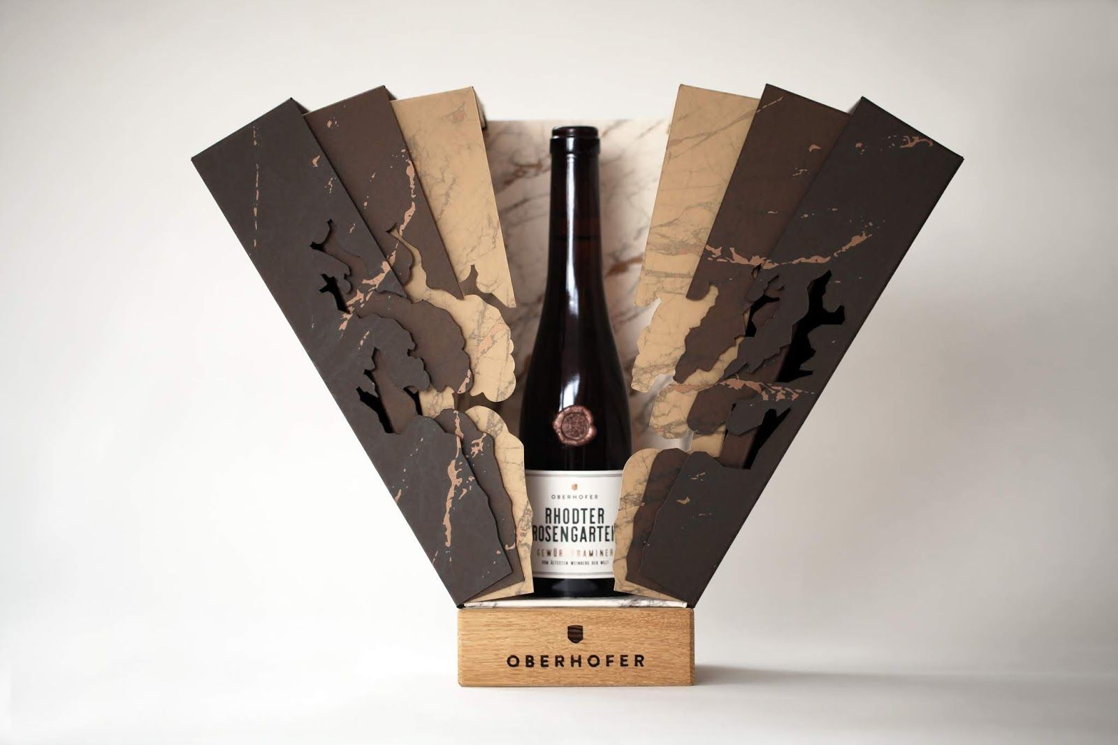 OBERHOFER德國紅酒包裝盒設(shè)計,外型似一顆樹,包裝的形狀與酒莊的葡萄園有關(guān),這款酒包裝設(shè)計的最大特點(diǎn)是打開時展開的效果,3層特種紙打開包裝時像一把折扇。底座的木塊不是一次性的,它像一個獎杯,非常有儀式感。印刷工藝:鋁箔沖壓