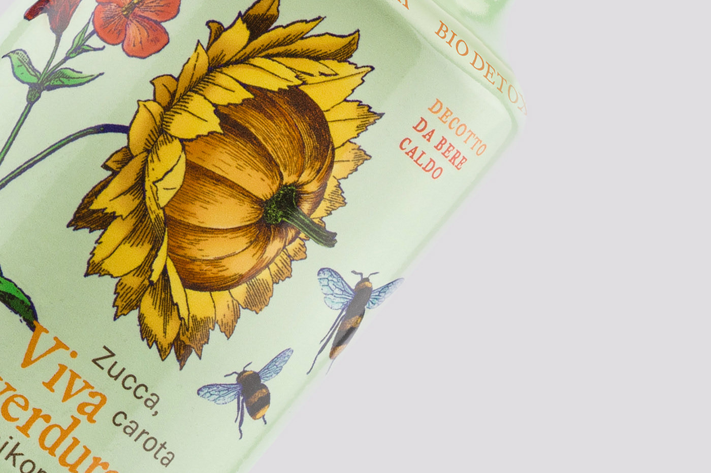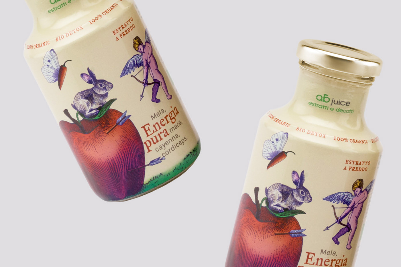 閱讀這一系列提取物的成分,您會(huì)發(fā)現(xiàn)異國(guó)情調(diào)的水果和花朵,并以原始的方式與蔬菜和香料結(jié)合在一起。在閱讀成分表時(shí),您似乎已獲得創(chuàng)建神奇藥水的說明。ABJuice系列的新包裝增加了帶有插畫的標(biāo)簽,完全包裹了玻璃瓶。這些插圖受古代百科全書的啟發(fā),描繪了成分成為主角的超現(xiàn)實(shí)場(chǎng)景。