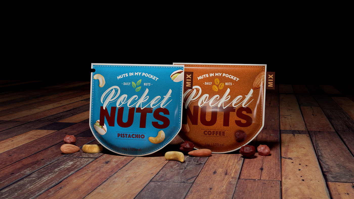 這是為忙碌的現(xiàn)代人設(shè)計(jì)的軟件包,他們每天都吃堅(jiān)果。這是堅(jiān)果,它們可以方便地隨身攜帶和食用牛仔褲口袋的概念。它有兩種口味,咖啡和開心果。