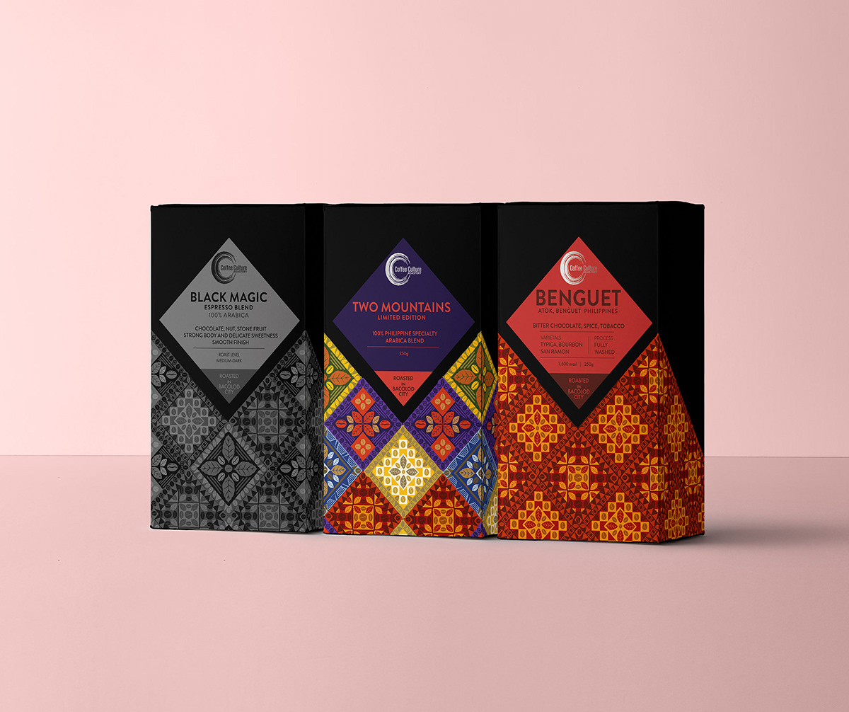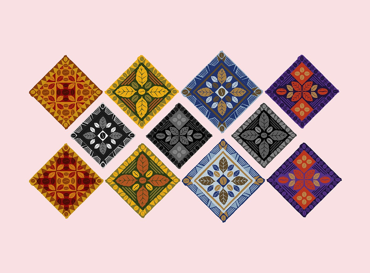 設(shè)計靈感具有中式傳統(tǒng)刺銹工藝,將咖啡的葉與豆用抽象的藝術(shù)形式表達出來,每一副插畫都是可以做為包裝衍生品,像絲巾