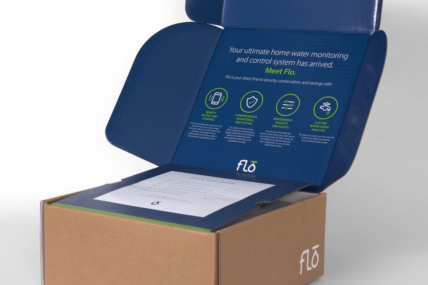 對(duì)于包裝設(shè)計(jì),我們創(chuàng)建了許多不同的選項(xiàng),以反映產(chǎn)品的核心理念以及Flo希望在客戶的思想中觸發(fā)的感覺(jué)。其中,選擇了以下帶有瓦楞紙箱的部件,它成為客戶體驗(yàn)的重要組成部分。然后,我們將相同的樣式應(yīng)用于諸如Smart Water Detector之類的未來(lái)產(chǎn)品。