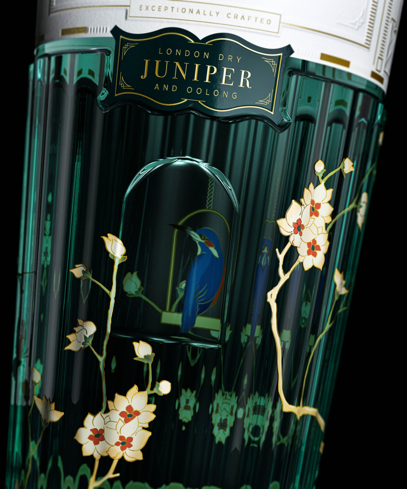 瓶身的設(shè)計(jì)靈感來自鳥籠的功能,而玻璃塞子則受慈禧皇后佩戴的傳統(tǒng)頭飾的影響。插畫風(fēng)格和技巧靈感來自清朝代花瓶,并營(yíng)造出籠中鳥兒的錯(cuò)覺。瓶子掛在盒子里完成概念。