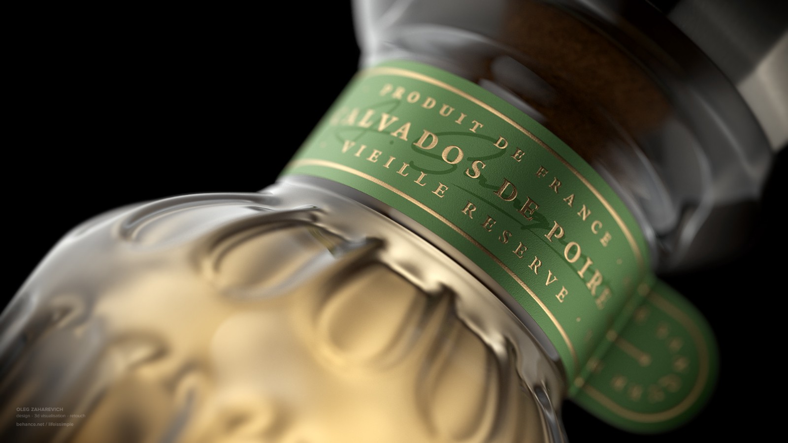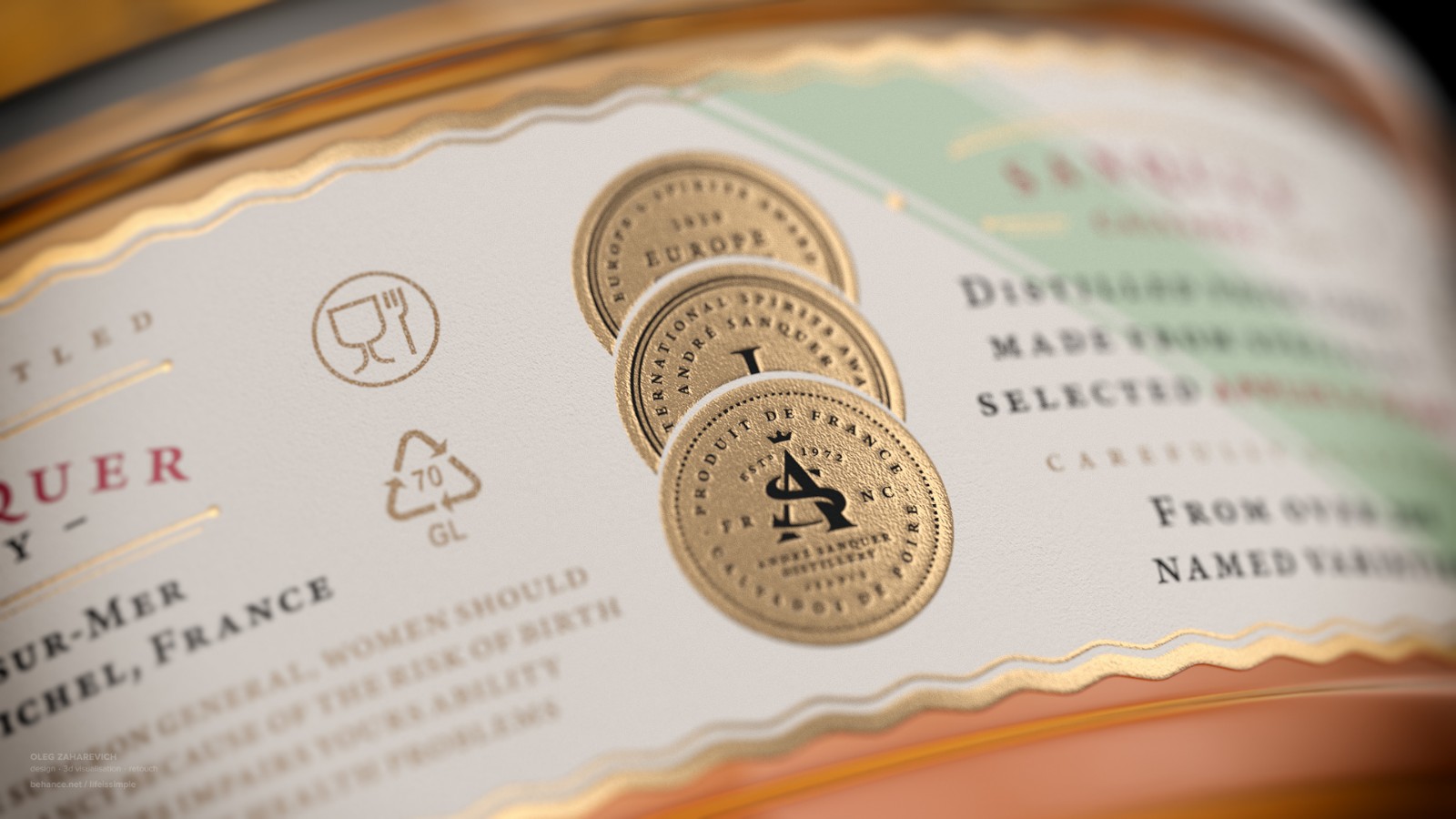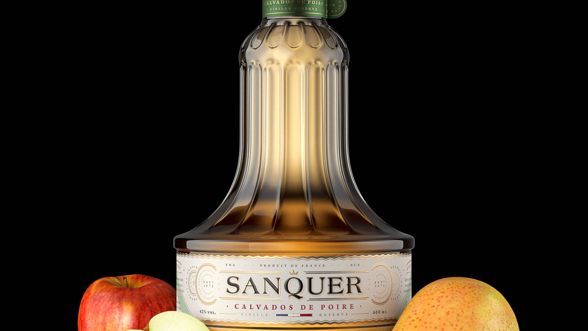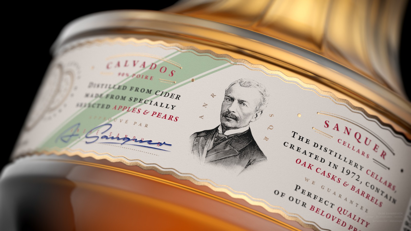 卡爾瓦多斯酒是一種具有三個(gè)主要產(chǎn)區(qū)的烈酒,其中一個(gè)主要是通過(guò)梨的蒸餾制成的。在研究這種法國(guó)精神時(shí),Oleg Zaharevich創(chuàng)建了一個(gè)虛構(gòu)的calvados品牌SANQUER。他使用CGI開(kāi)發(fā)了品牌標(biāo)識(shí),在瓶子的形狀和標(biāo)簽上放置了特定的細(xì)節(jié)。為了反映烈酒的主要成分,他制作了一個(gè)梨形的瓶子,它的脖子和圓潤(rùn)的身體細(xì)長(zhǎng)。他使用金箔數(shù)字化設(shè)計(jì),將細(xì)線和圓圈組合在一起,優(yōu)雅地設(shè)計(jì)了標(biāo)簽。包括極簡(jiǎn)主義的窄幅法國(guó)國(guó)旗標(biāo)志,以進(jìn)一步強(qiáng)調(diào)該虛構(gòu)品牌的歷史和文化。