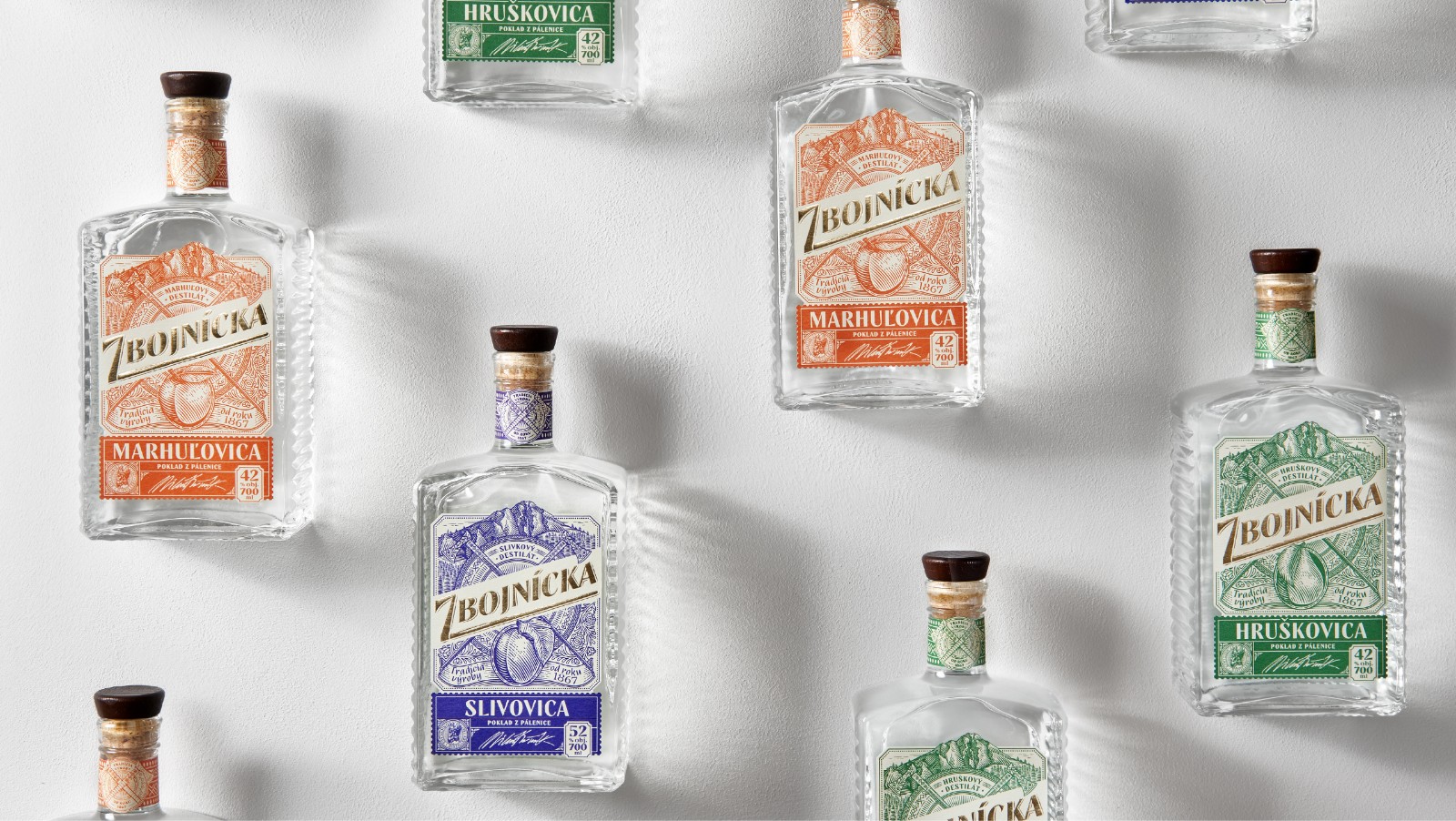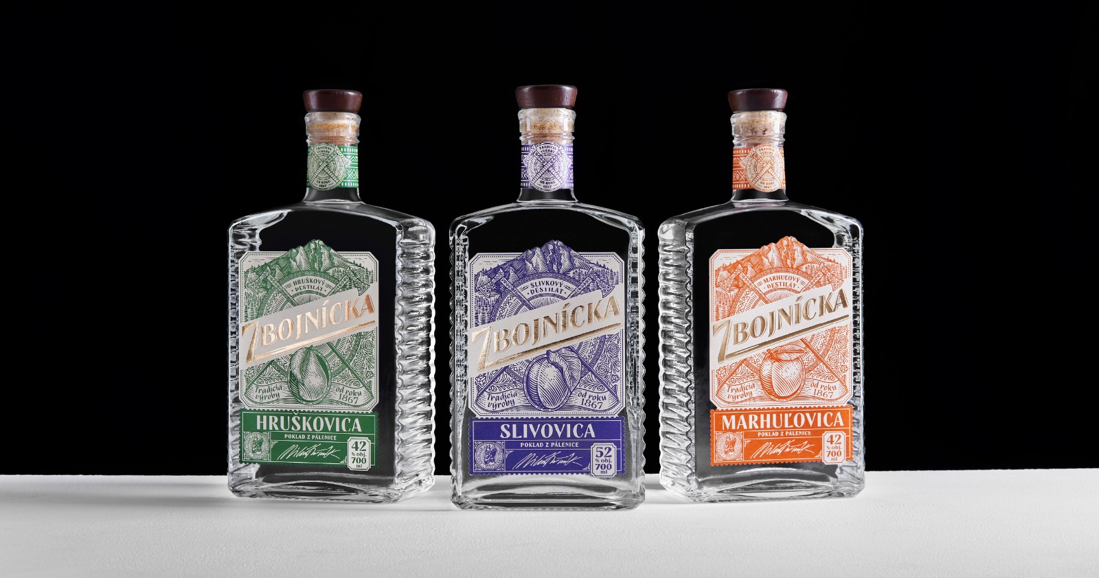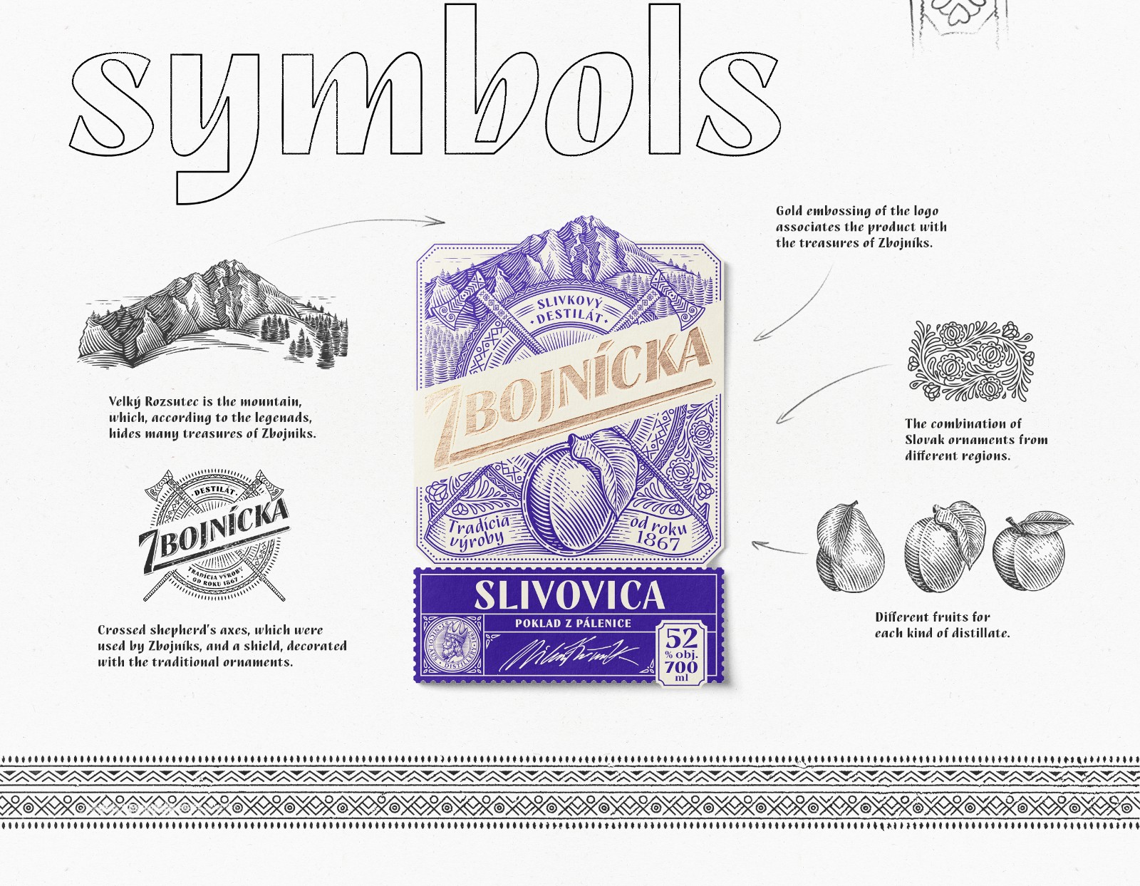 我們選擇了質(zhì)地柔軟的冰霜紙,以喚起一種天然的、自制的產(chǎn)品的感覺。雕刻風格的插圖創(chuàng)造了一種被轉(zhuǎn)移到過去的印象。Zbojníks使用的十字牧羊人斧頭和一個飾以Mala Fatra地區(qū)傳統(tǒng)裝飾品的盾牌被放置在標簽的中央。它們共同象征著Zbojníks人的特征--他們好戰(zhàn)的本性,愿意戰(zhàn)斗和保護他們的珍寶。標簽的頂部是著名的韋爾克羅祖特克山的雕刻插圖,根據(jù)傳說,這里藏有許多珍寶。這種來自不同地區(qū)的斯洛伐克裝飾品的組合,增強了一個真正的本地,傳統(tǒng)產(chǎn)品的形象。