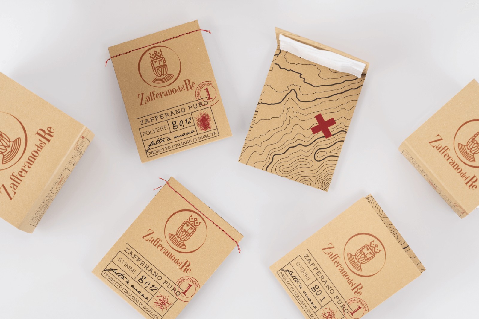 “ Zafferano del Re”徽標是Alaric寶藏的傳說。一家年輕的公司培育出一種珍貴而古老的產(chǎn)品-藏紅花,它被稱為紅金,是地球的瑰寶。它在守衛(wèi)國王金幣的土地上如此精確地工作,該品牌以現(xiàn)代風格代表不規(guī)則圓圈內(nèi)的國王阿拉里克(King Alaric)的面孔,讓人回想起古代鑄造的金幣形狀。包裝由明顯差的材料制成,并通過手工處理而高貴,例如,小袋由用藏紅花紅線進行的接縫封閉。另外,為重申這一概念,每包都包含一張藏寶圖。